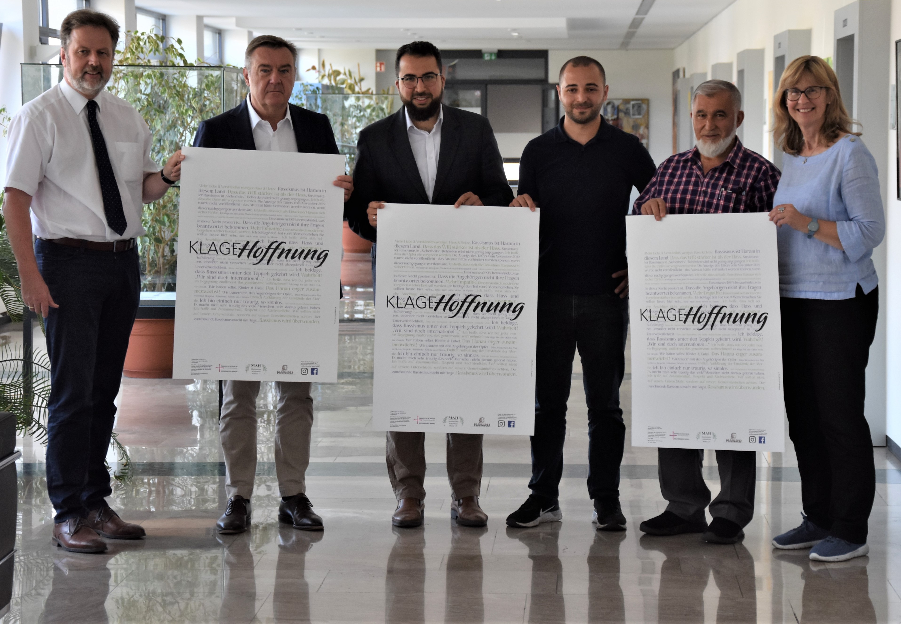 Rekapitulierten die Aktion „Klage und Hoffnung“, die anlässlich des zweiten Jahrestags des schweren Anschlags vom 19. Februar stattgefunden hatte: Dekan Dr. Martin Lückhoff, Oberbürgermeister Claus Kaminsky, Imam Mustafa Macid Bozkurt, Ahmet Akyüz, Vorsitzender des Muslimischen Arbeitskreises Behlül Yilmaz und Pfarrerin Katrin Kautz (von links).