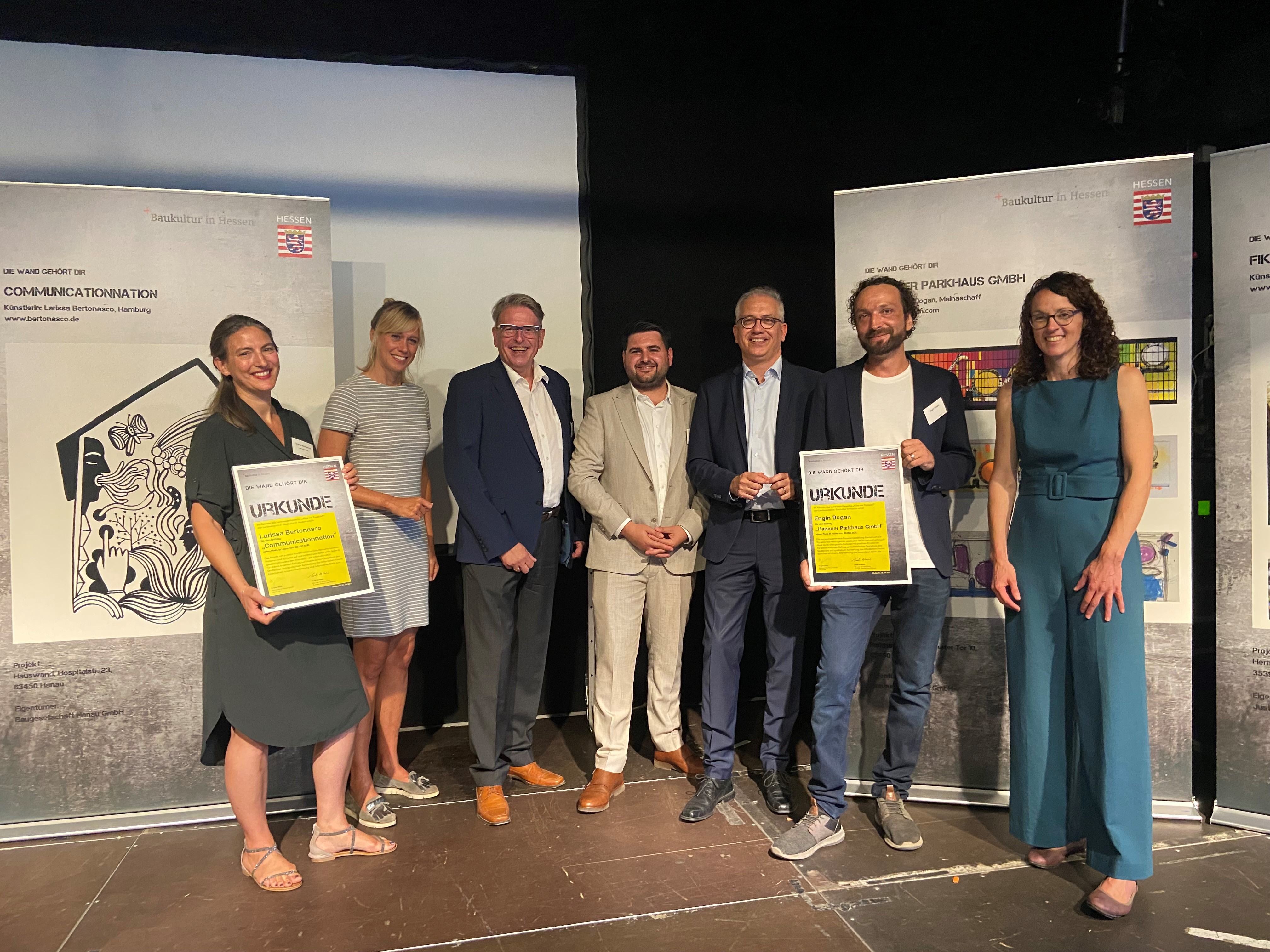 Larissa Bertonasco (links) und Engin Dogan (2. von rechts) freuen sich in Beisein von Mirja Dorny (Geschäftsführerin der Baugesellschaft Hanau), Stadtrat Joachim Stamm, Ercan Celik (Hanauer Parkhaus GmbH), Minister Tarek Al-Wazir und Ministerin Angela Dorn über den Zuschlag für ihre Kunstprojekte in Hanau.