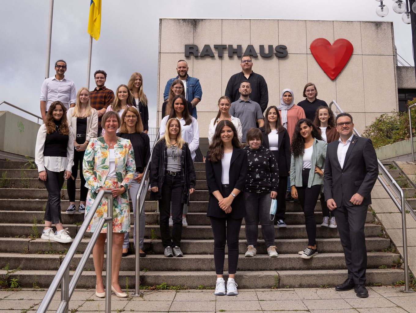 Bürgermeister Michael Joithe (r.) und Personalleiterin Daniela Eitzert (vorne l.) begrüßten die neuen Auszubildenden der Stadt Iserlohn.