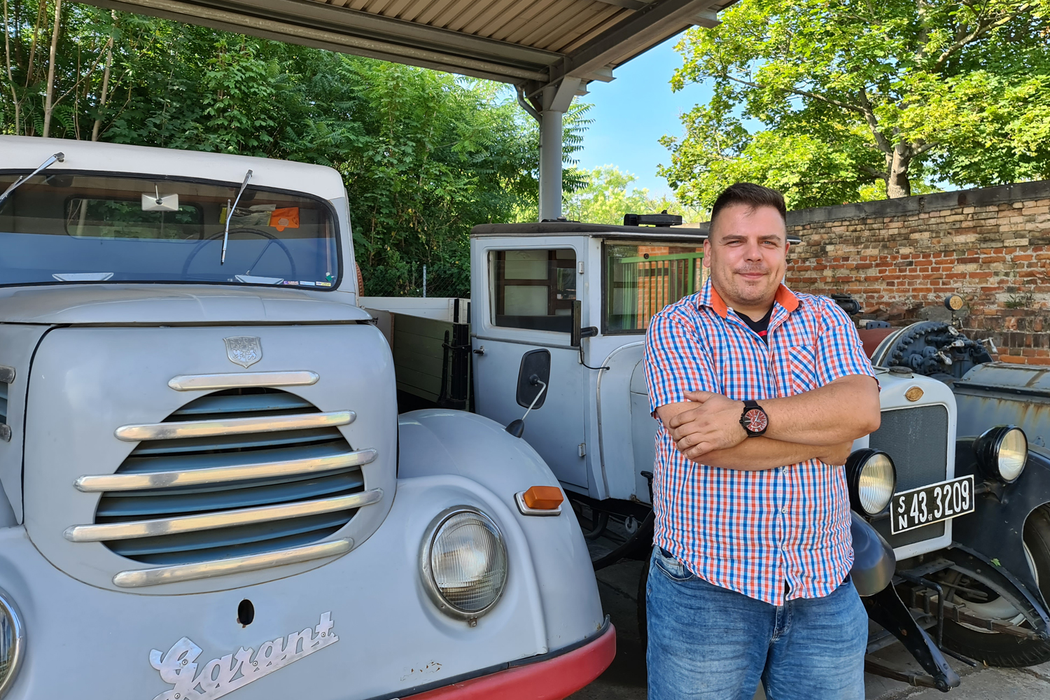 Dr. Christian Marlow steht vor den historischen Fahrzeugen im Außengelände des Technikmuseums.