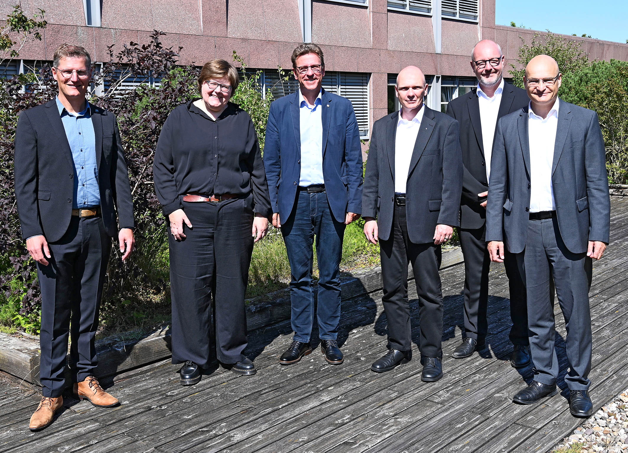Sprachen beim jährlichen Treffen über den Zusammenhalt der Gesellschaft und die aktuelle Situation Geflüchteter (v. l.): Sozialdezernent Tilman Fuchs, Superintendentin Susanne Falcke, Superintendent André Ost, Geschäftsführer des Kreisdekanats Matthias Kaiser, Kreisdechant Jochen Reidegeld und Landrat Martin Sommer.