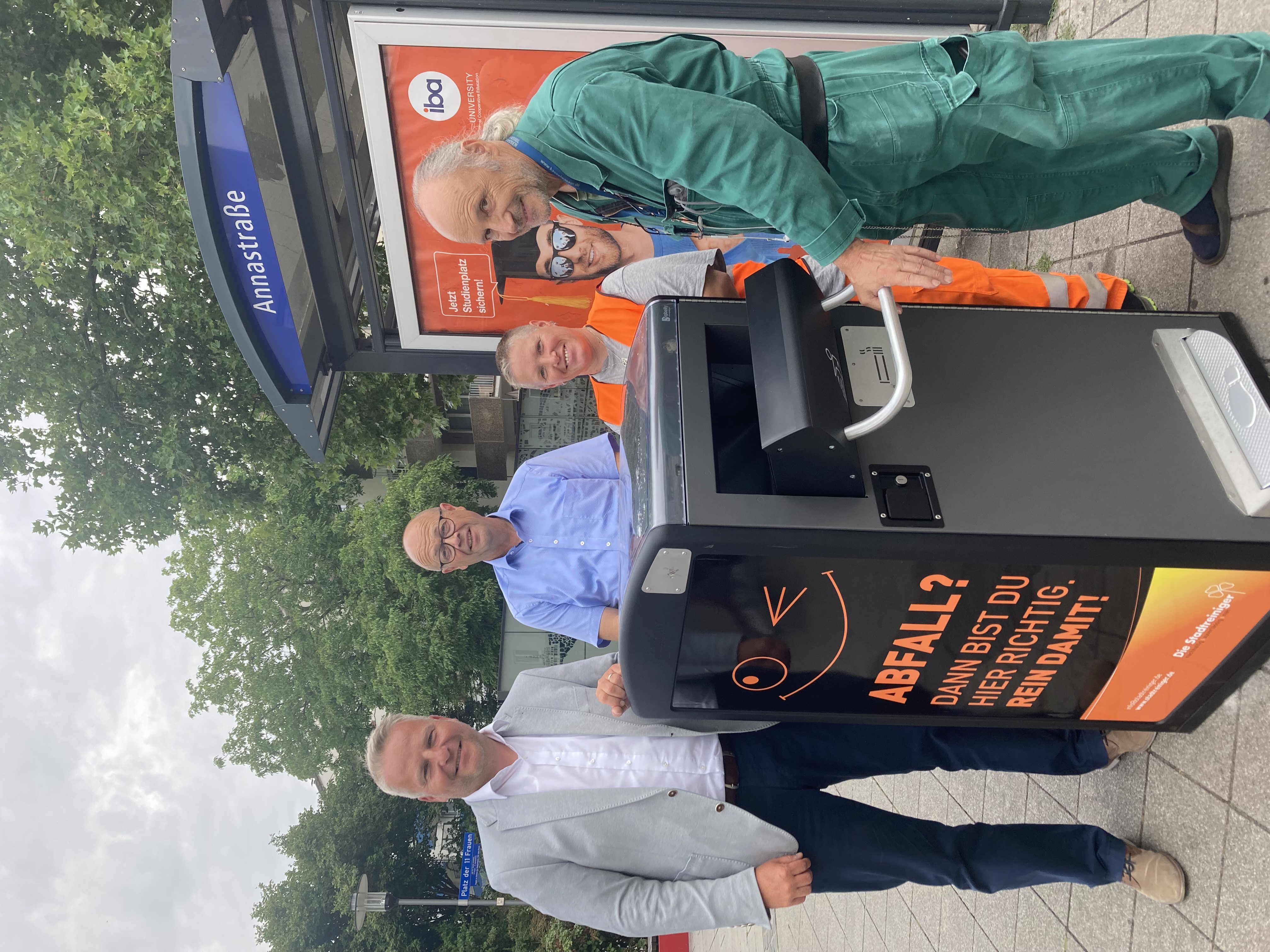 Zwei Bigbelly-Papierkörbe mit Solarpresse stehen ab sofort auf dem „Platz der 11 Frauen“: (v.li.) Ordnungsdezernent Dirk Stochla, Peter Schaumburg, Betriebsleiter Stadtreiniger Kassel, Yvonne Hannappel, Mitarbeiterin der „Müllbusters“, und Sebastian Bleisch, engagierter Quartiers-Bewohner und Organisator des „Anna-Markts.