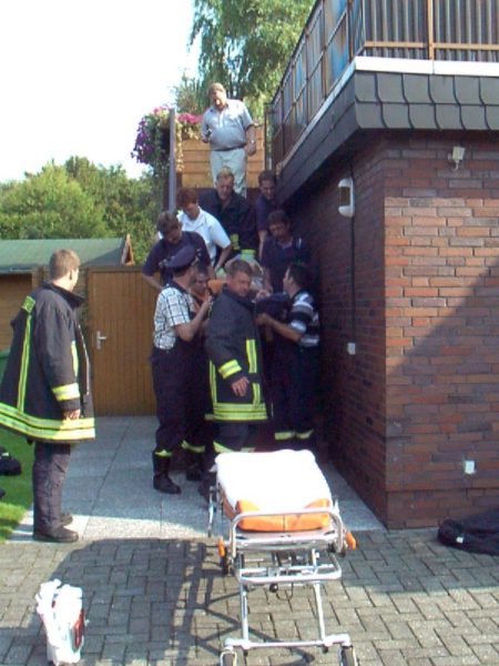 Mit vereinten Kräften wird der Patient zum Rettungswagen gebracht
