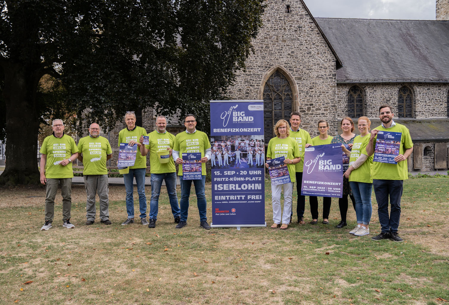Laden zum Konzert der Big Band der Bundeswehr auf den Fritz-Kühn-Platz ein (v.l.) Dirk Matthiessen (Leiter Stadtmarketing), Mark Williams (Veranstaltungssicherheit Stadtmarketing), Wilfried Pieper (Big Band JazZination der Gesamtschule Iserlohn), Jens Neffin (Forsthaus Löhen), Bürgermeister Michael Joithe, Bettina Wichmann (Leiterin Ambul. Kinderhospizdienst "Kleine Raupe"), Gerd Wichmann, Simone Korte, Laura Niehus und Judith Miklis (alle Stadtmarketing) sowie Jonas Seid (Johanniter Unfallhilfe Südwestfalen).