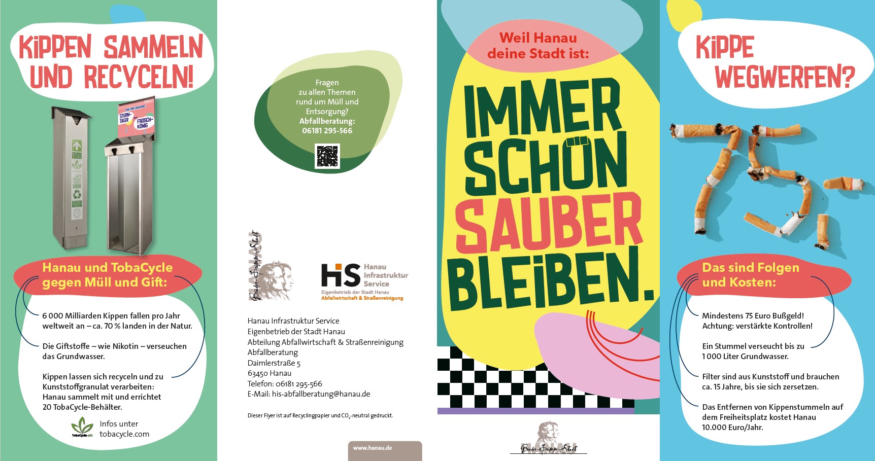 Auf einem eigens hierzu entworfenen Flyer zeigt der Eigenbetrieb Hanau Infrastrukturservice (HIS) während des World Cleanup Days auf, wie teuer das wilde Entsorgen von Zigarettenkippen oder Kaugummis sein kann. Auch die Bußgelder, die Hundebesitzer erwarten, die sich weigern, die Hinterlassenschaften ihres Haustiers zu entsorgen, werden benannt.