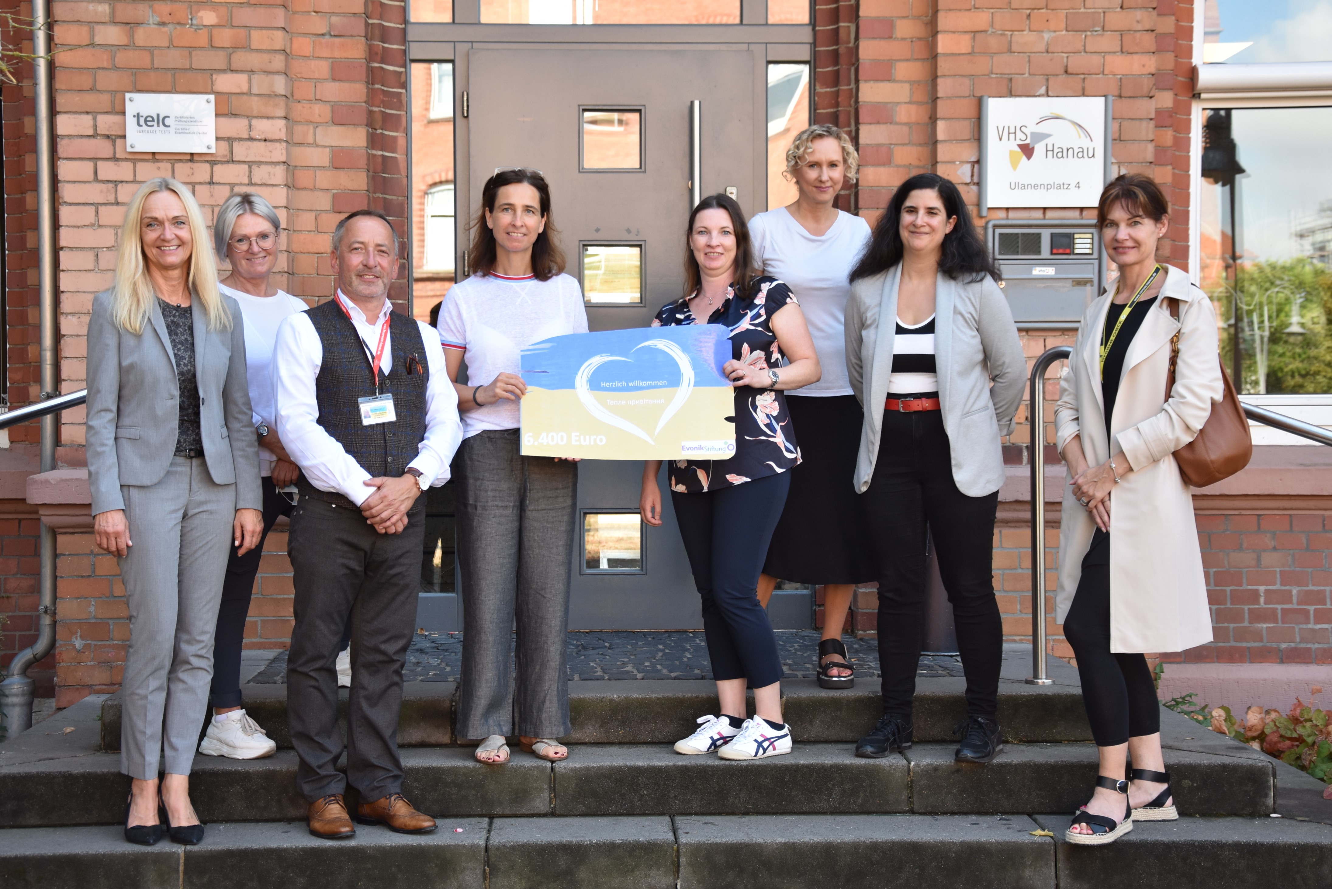 Ein starkes Team, das den ukrainischen Frauen die Teilnahme am Sprachkurs ermöglicht: Kerstin Oberhaus von Evonik, Standortleiterin Industriepark Wolfgang, Silke Kreis, Sprachkoordinatorin für Geflüchtete und Zugewanderte der VHS Hanau, Uwe Niemeyer, Strategischer Leiter der Koordinierungsstelle Ukraine der Stadt Hanau, Elke Hohmann, Leitung der Volkshochschule Hanau, Dr. Heike Bergandt, Geschäftsführerin der Evonik Stiftung, Silke Wodarczak, Standortkommunikation von Evonik Hanau, Dr. Judith Lechner, Sprachenkoordination für Geflüchtete und Asylbewerber*innen der Volkshochschule, sowie Andrea Schreiber, Mitarbeiterin der Koordinierungsstelle Ukraine der Stadt Hanau (von links).