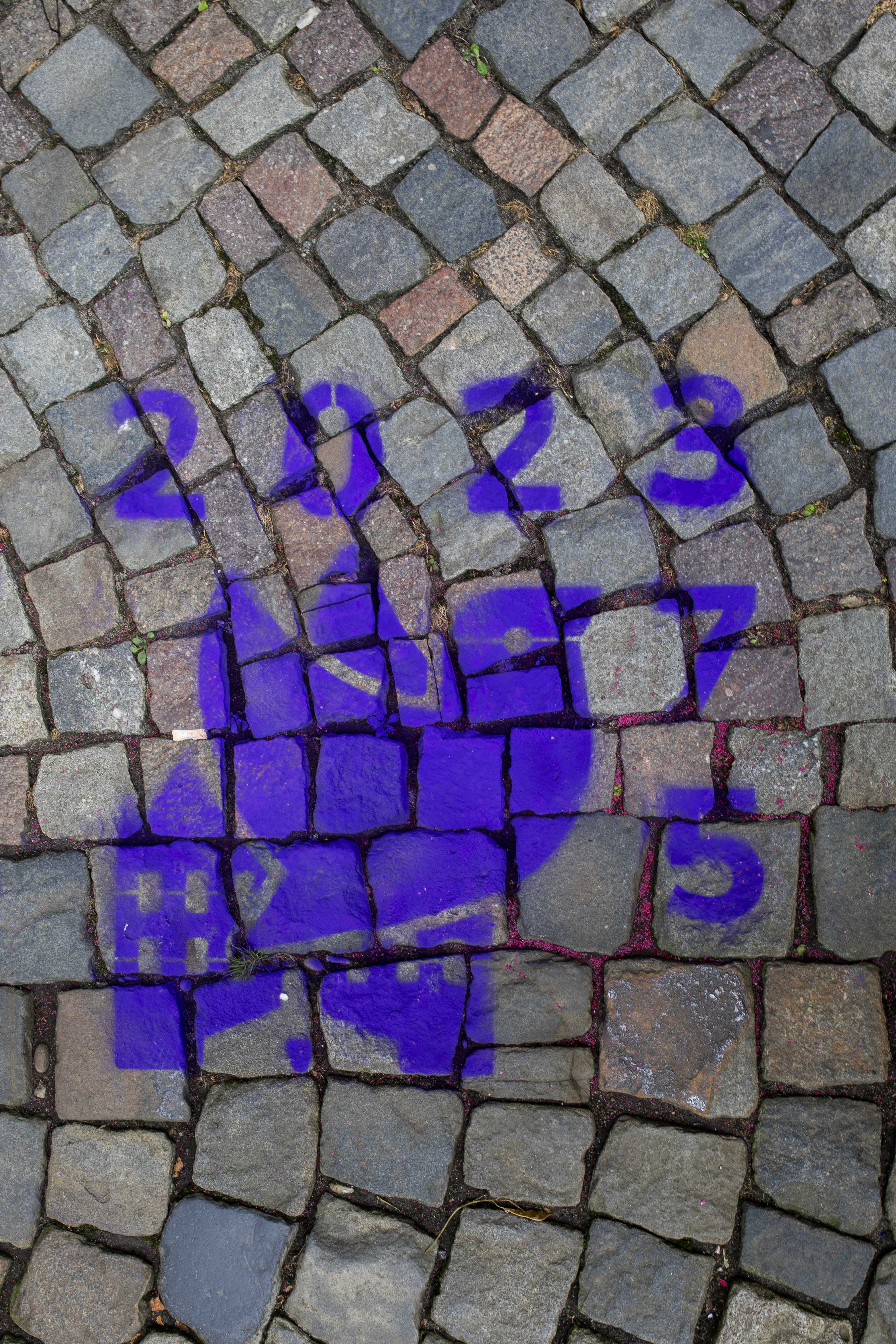 Das Logo Jubiläum 375 Jahre Westfälischer Friede in Sprühkreide als nicht wasserfestes Zeichen auf dem Pflaster.