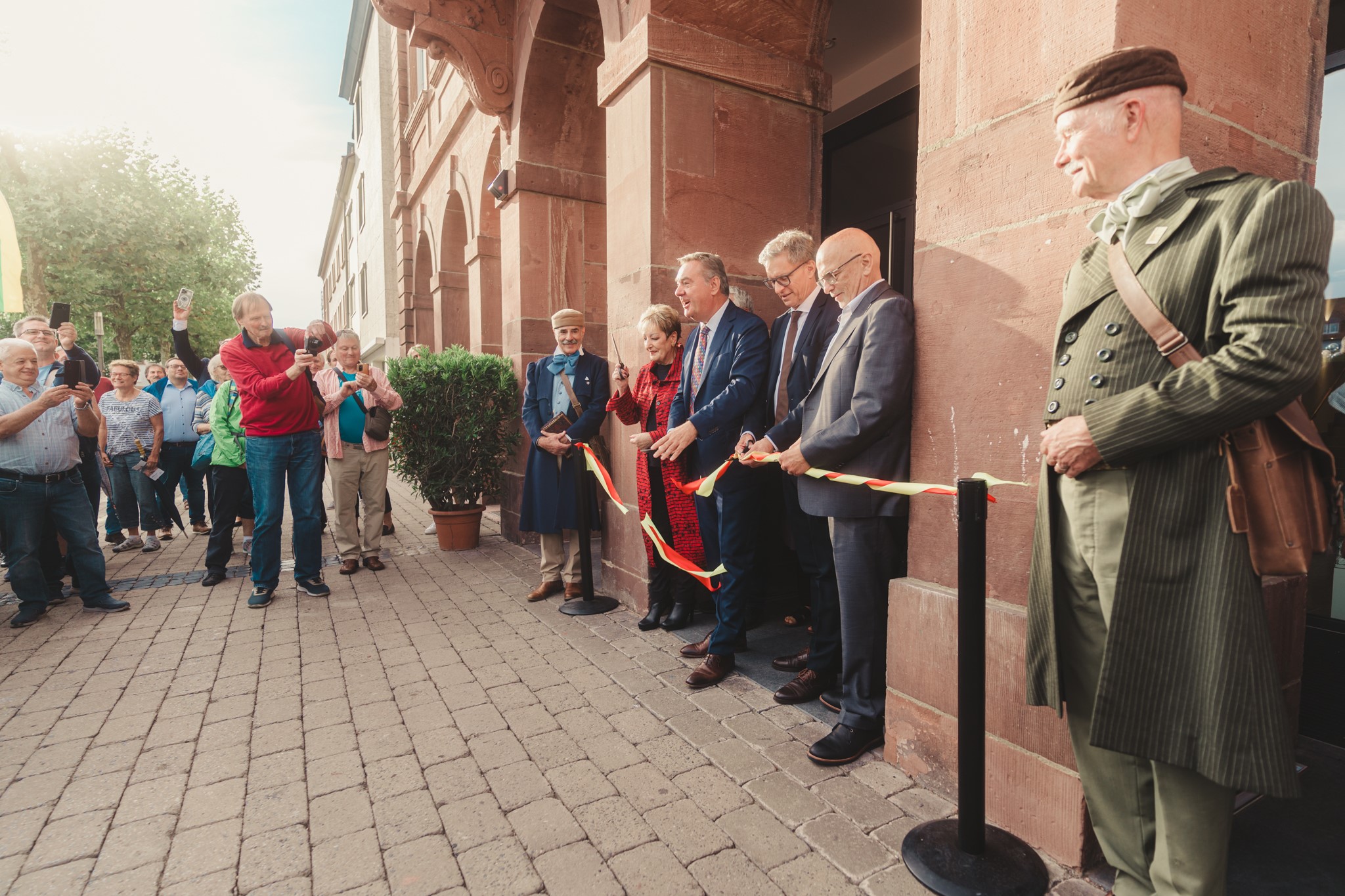 Zum Ende der Feierlichkeiten zerschnitten Stadtverordnetenvorsteherin Beate Funck, Oberbürgermeister Claus Kaminsky, Stadtrat Thomas Morlock und Bürgermeister Axel Weiss-Thiel (von links) gemeinsam das Band am Eingang des Rathauses.