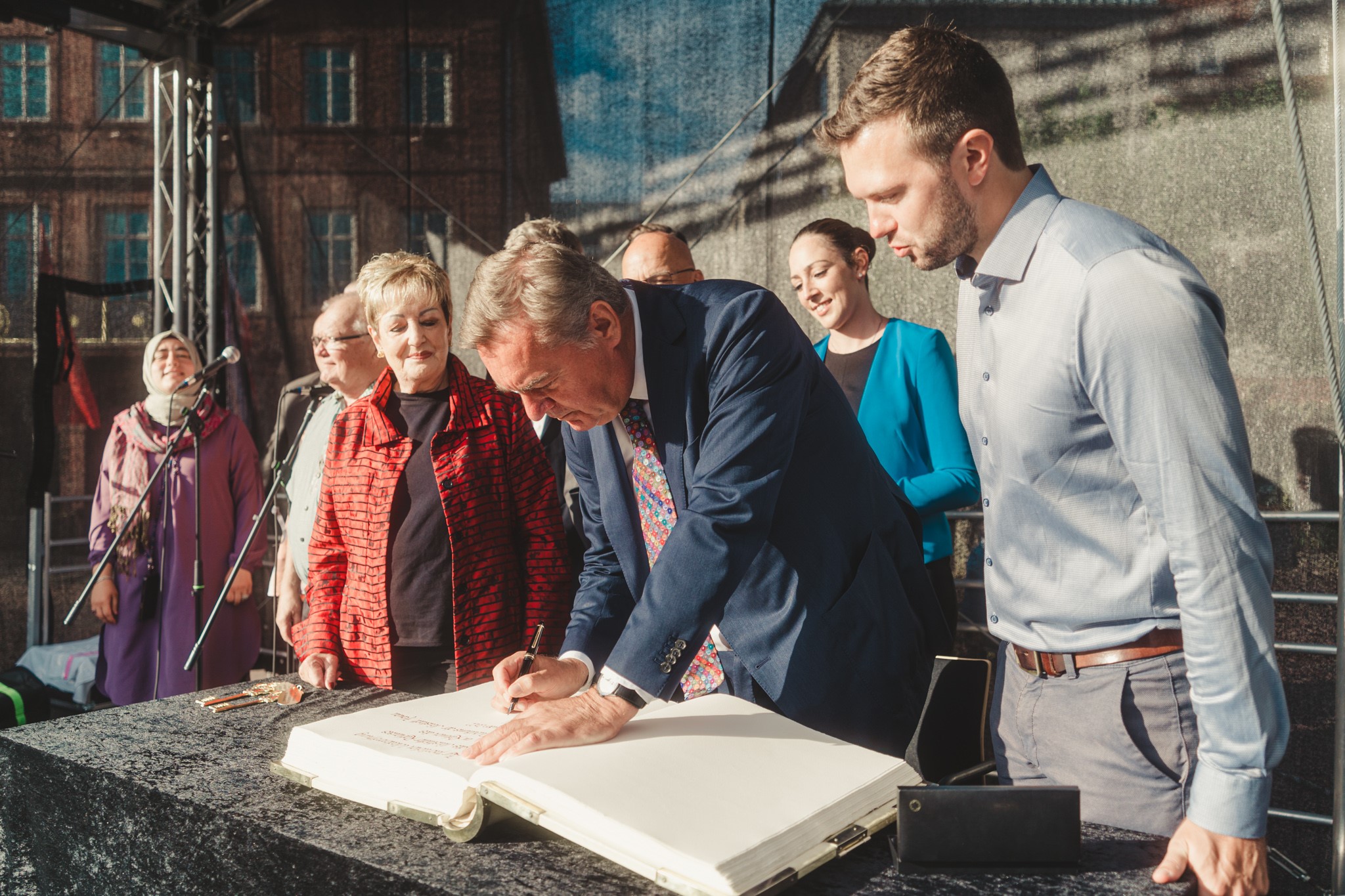 Der hauptamtliche Magistrat, die Stadtverordnetenvorsteherin sowie sämtliche Fraktionsvorsitzende der Stadtverordnetenversammlung trugen sich im Zuge der Rathaus-Wiedereröffnung in das goldene Buch der Stadt ein.