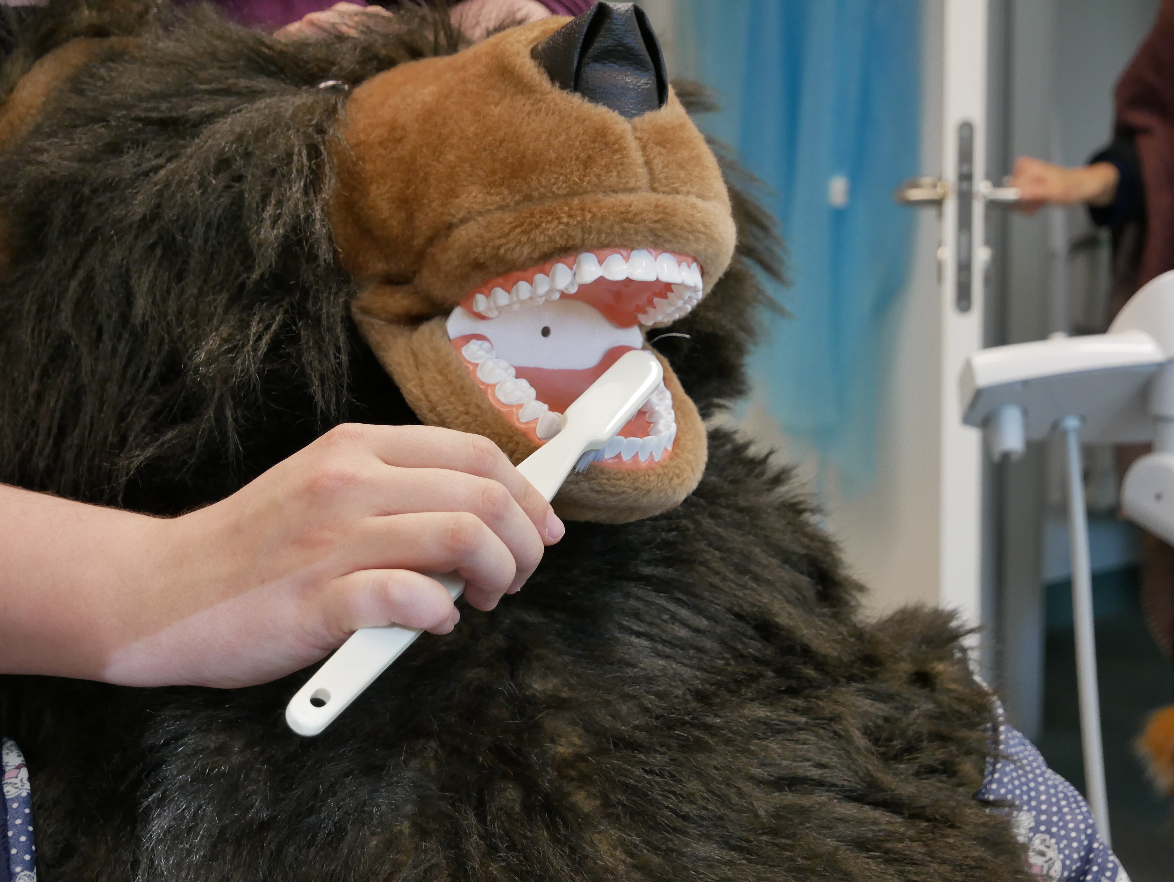 Mit Hilfe eines großen Stoffbären erklären die Zahnärzte, wie Kinder richtig die Zähne putzen. Foto: Max Rolke – Kreis Unna