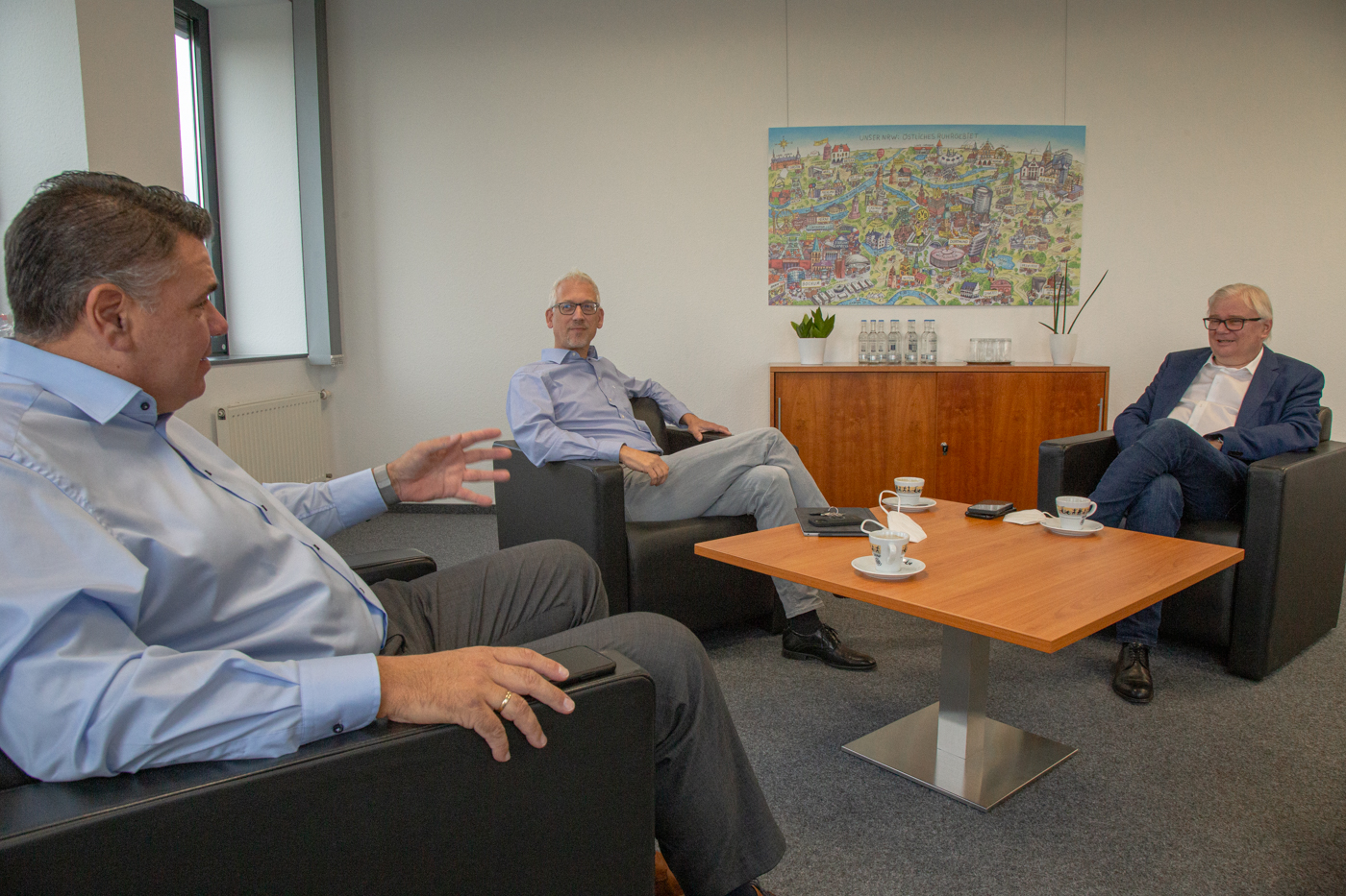 Landrat Mario Löhr und Sozialdezernent Torsten Göpfert im Gespräch mit dem Geschäftsführer des Jobcenters Kreis Unna Uwe Ringelsiep.