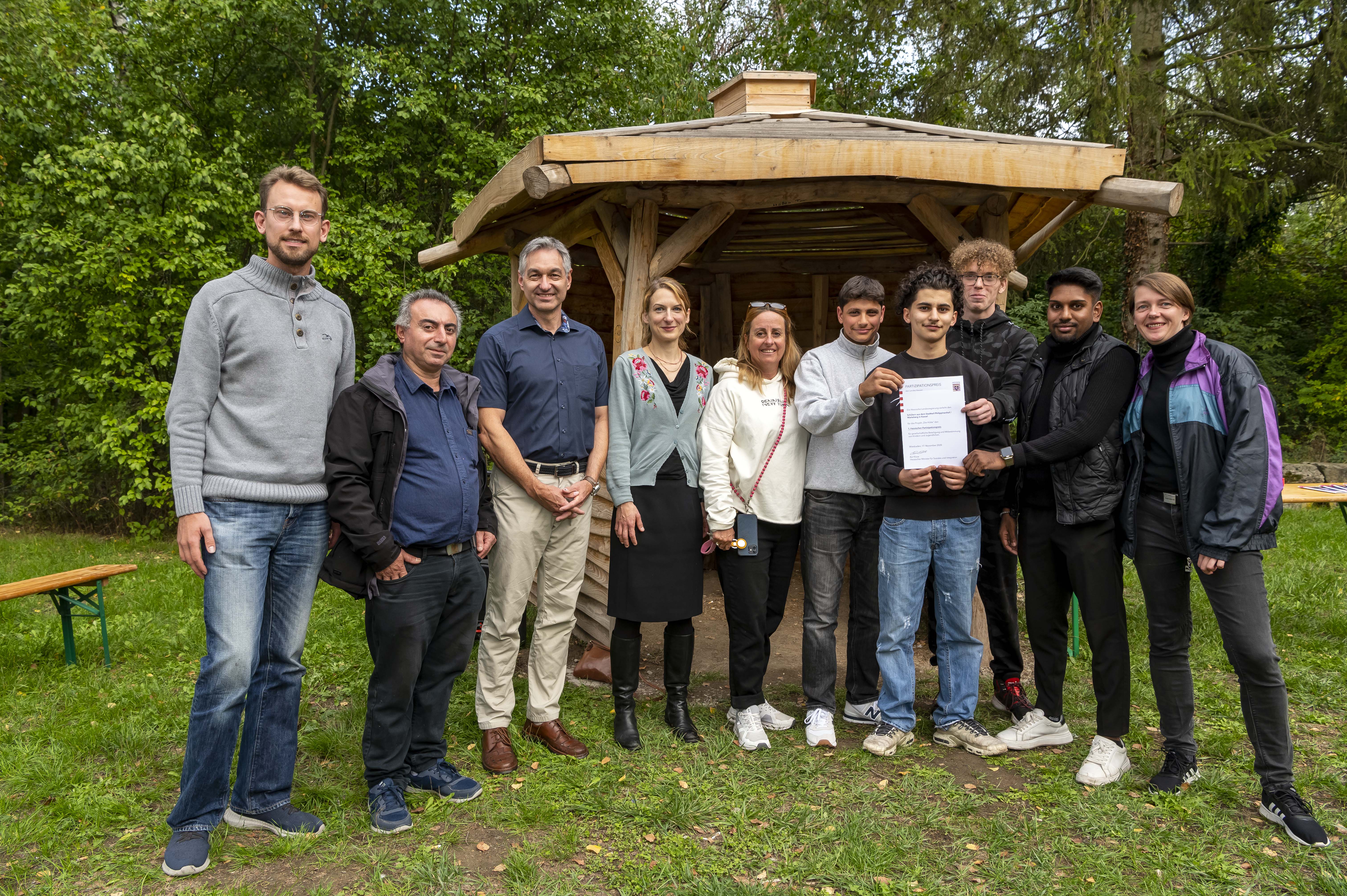 v. l.: Maximilian Bathon (Ortsvorsteher Philippinenhof/Warteberg), Ali Timtuk (Ortsvorstehen Nord-Holland), Stefan Makel (Projekt-Pate), Jugenddezernentin Nicole Maisch, Stephanie Klein (Kinder- und Jugendförderung), Suphi Sahut, Yasin Sakin, Jeff Küchmann, Aneishan Ananthanathan (Projektbeteiligte), Raphaela Becker (Kopiloten e.V.)