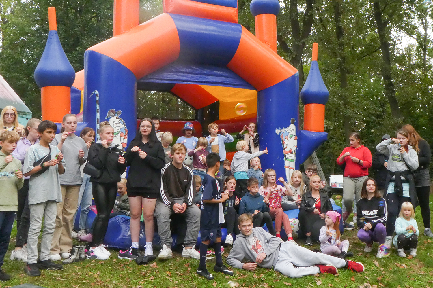 Die Kinder und Jugendlichen haben sich gemeinsam vor der Hüpfburg versammelt und haben Seifenblasen gemacht.