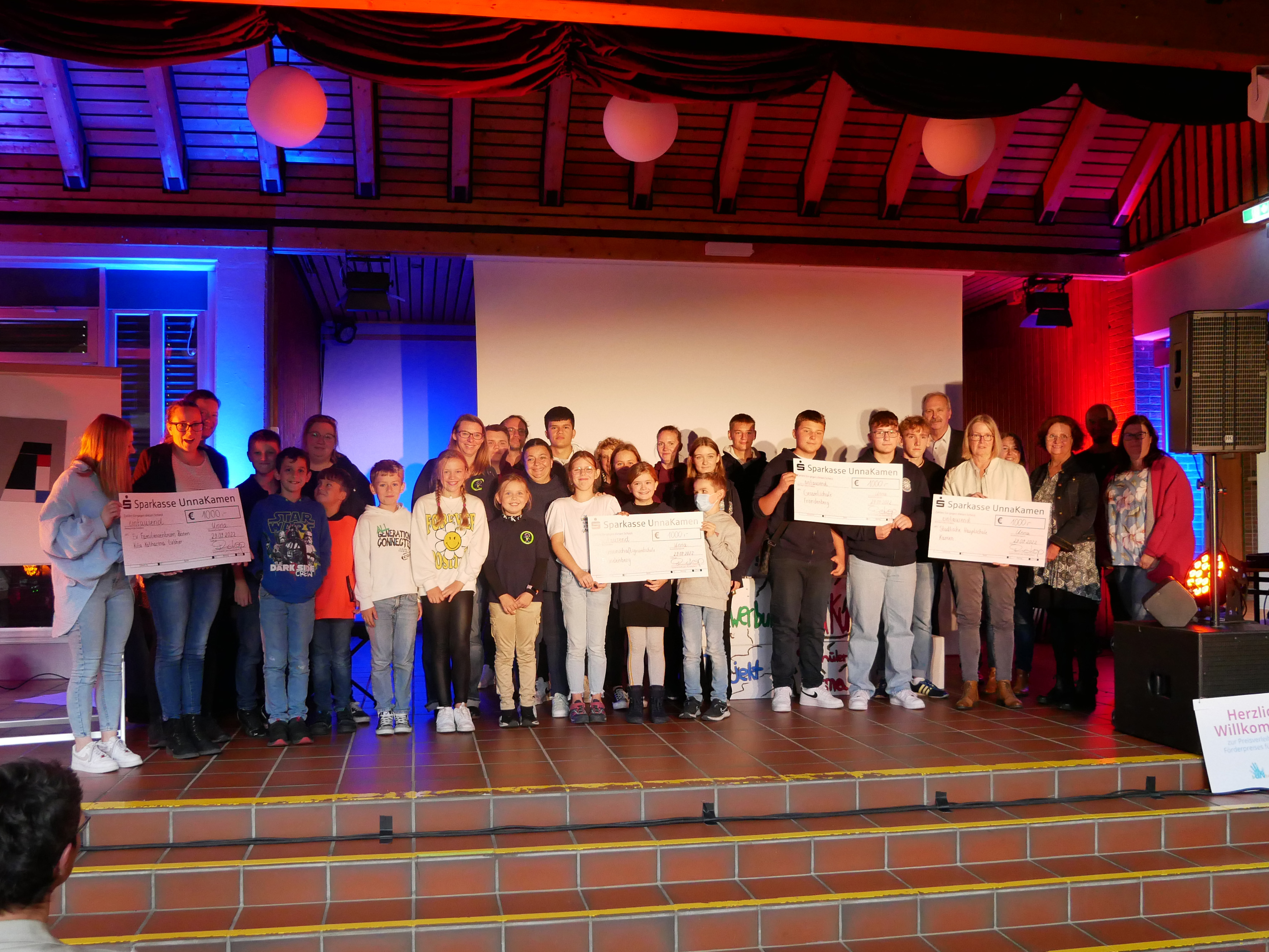 Die Vertreter und Schüler der vier Gewinner des Förderpreises Inklusion 2022 zusammen mit dem stellvertretenden Landrat Martin Wiggermann (6 v. r.), Foto: Leonie Bleimling – Kreis Unna