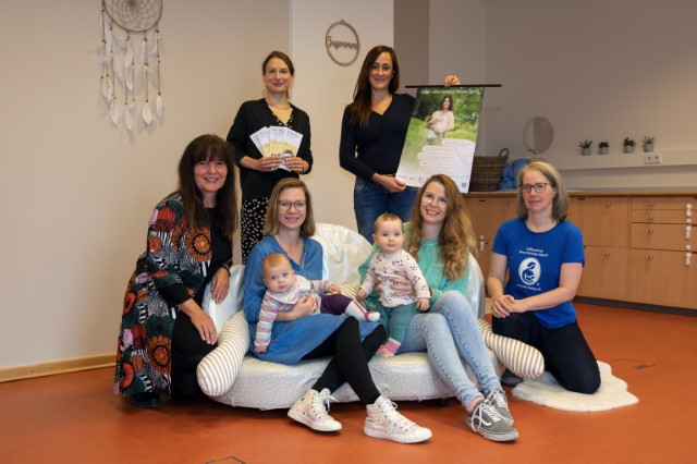 hinten v. l.: Petra Haas (Gesundheitsamt, Willkommen von Anfang an), Dezernentin Nicole Maisch, Lena Kricheldorff, Leiterin der Evangelische Familienbildungsstätte Kassel und des Evangelisches Familienzentrum Wehlheiden, Stillberaterin Christiane Stange auf dem Sofa v. l.: Mutter Anna mit Tochter Romy sowie Mama Sarah mit Tochter Ella