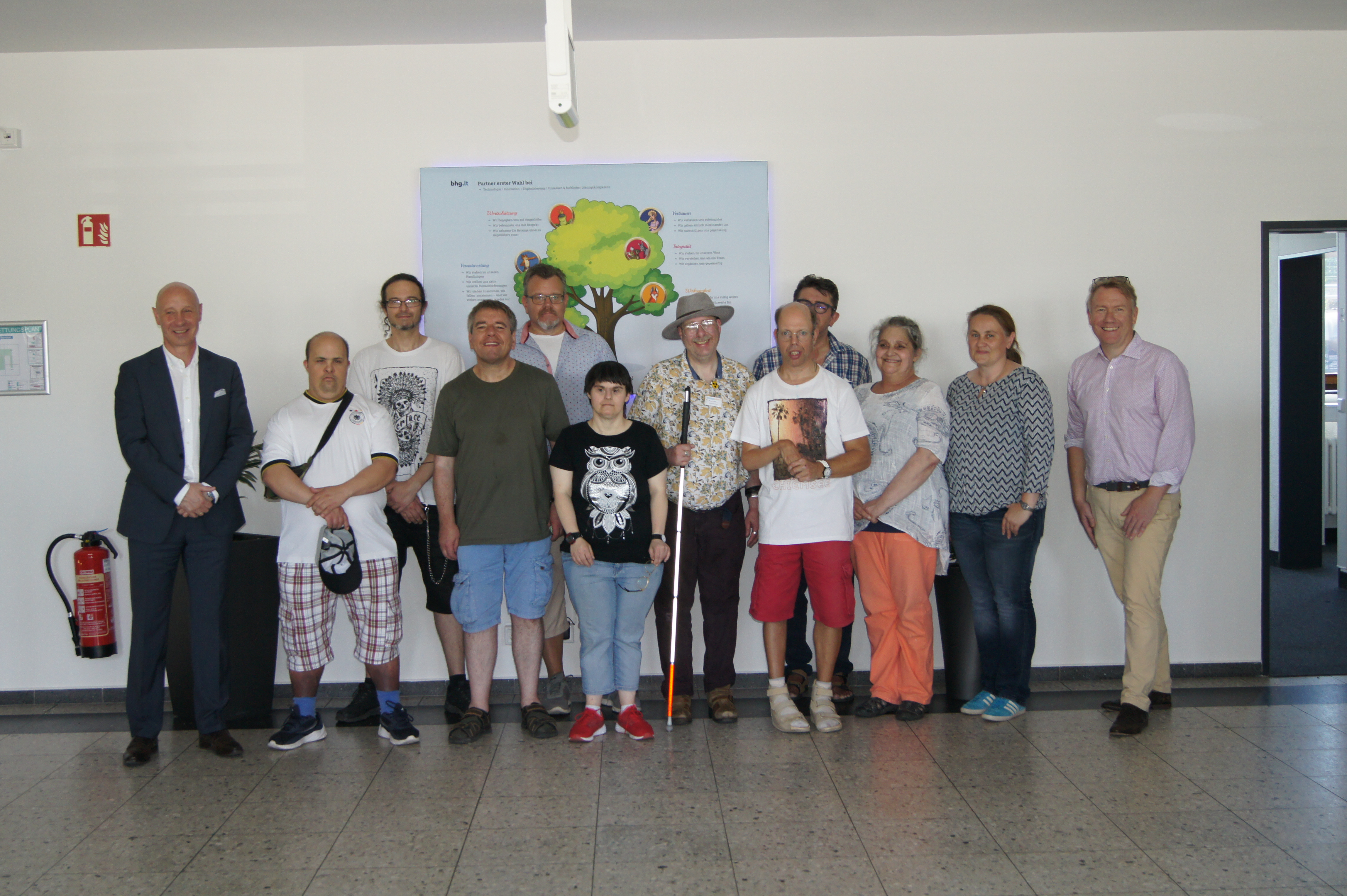 Farbenprächtige Bilder von Künstlerinnen und Künstlern mit Behinderungen sind zurzeit in der IT-Abteilung der BeteiligungsHolding Hanau GmbH am Standort nahe dem Hauptbahnhof zu sehen. Bei der Vernissage (von links): Markus Menzen (Geschäftsführer BeteiligungsHolding Hanau GmbH) mit den Künstlerinnen und Künstlern Monir Chaatouf, Christian Palm, Peter Beilstein, Stephan Queke, Daniela Milia, Robertino Rims, Holger Wolfart, Agop Talsik und Nadja Michailoff sowie Nicole Pietschmann (Gruppenleitung Brockenhaus) und Jens Schreiter (Leiter BHG-IT).