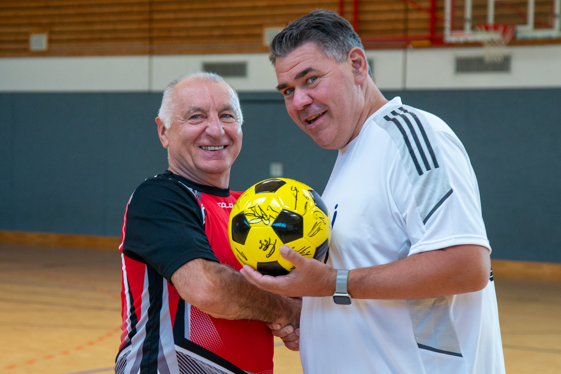 Die Landräte Marek Kwiatkowski und Mario Löhr (links) ließen sich das Spiel der Delegationen nicht entgehen. Das breitere Lächeln liegt dem polnischen Landrat im Gesicht, dessen Team mit drei Toren Unterschied gewann.