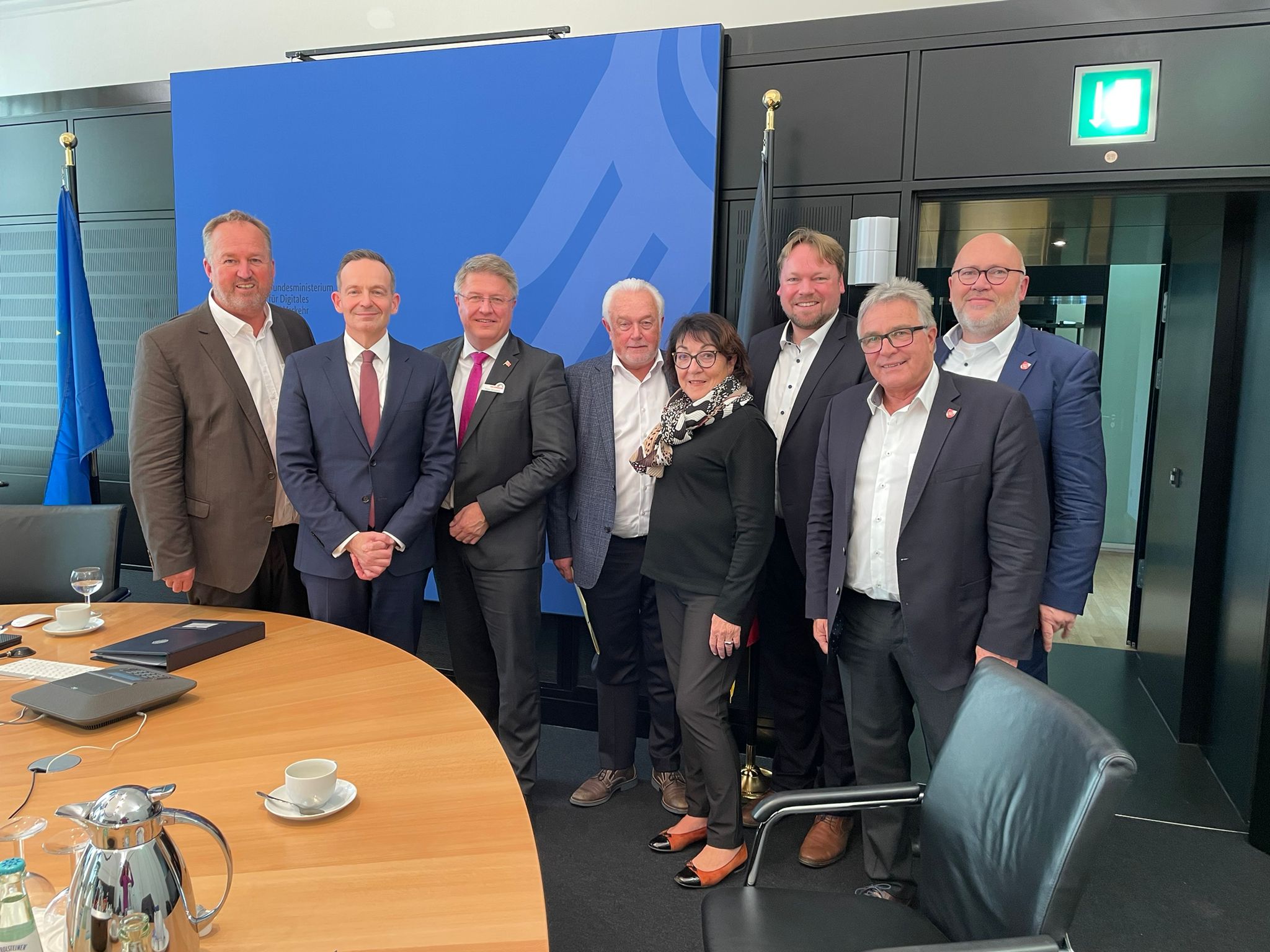 Sprachen in Berlin über die Elbfähre Cuxhaven-Brunsbüttel: (v.l.) Uwe Santjer, Volker Wissing, Stefan Mohrdieck, Wolfgang Kubicki, Veronika Kolb, Oliver Kumbartzky, Michael Kunkowski und Martin Schmedtje. Foto: Stadt Cuxhaven