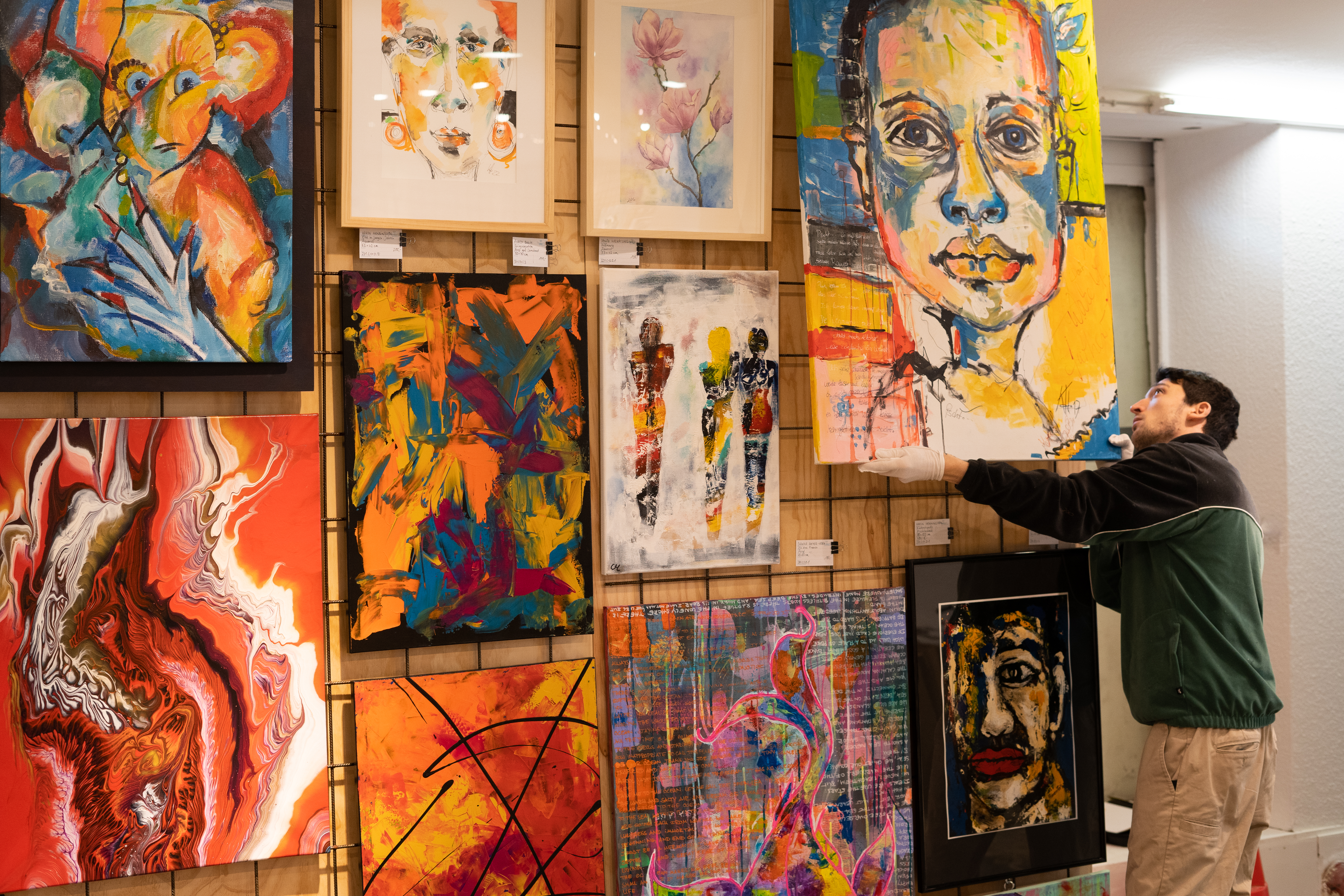Die Mitarbeiter des KunstKaufLADEN Tacheles hängen derzeit die neuen Kunstwerke auf.