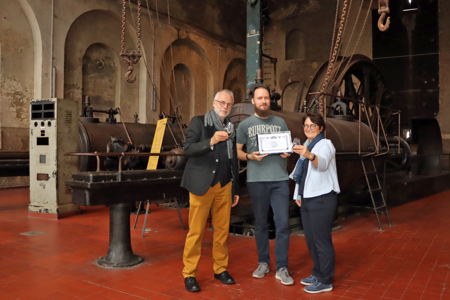 Bürgermeister Matthias Müller, Unternehmensgründer Björn Nessmann und Frauke Wiering von der Wirtschaftsförderung der Stadt Herten besichtigten die Maschinenhalle auf dem ehemaligen Zechengelände Schlägel & Eisen.