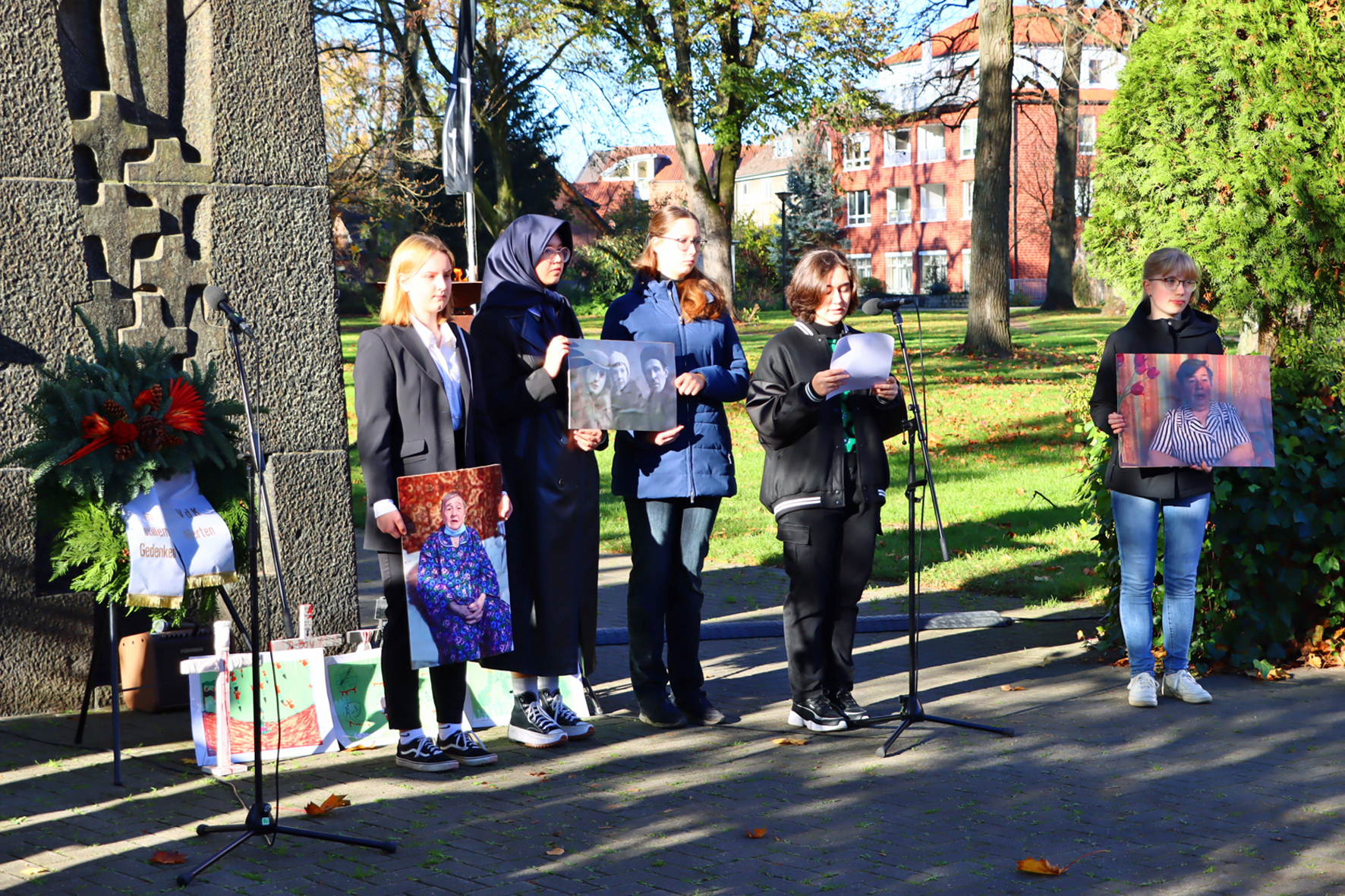 Fünf Schülerinnen des Städtischen Gymnasiums erinnerten an die Holocaust-Überlebende Vanda Obiedkova.
