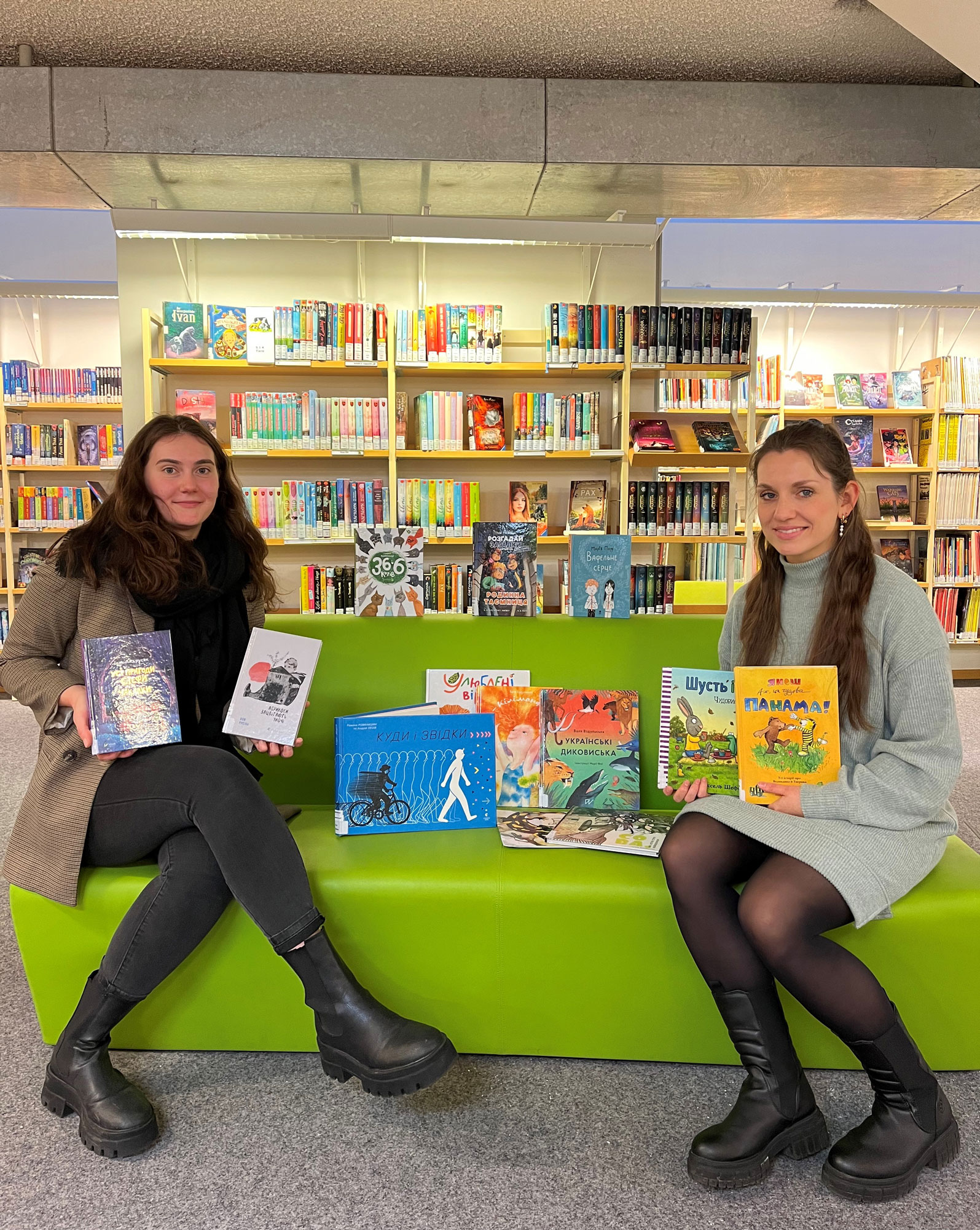 Bibliothekarin Adriane Kotzott (rechts) und Lea Marx (links) präsentieren einen Teil der ukrainisch-sprachigen Bücherauswahl.