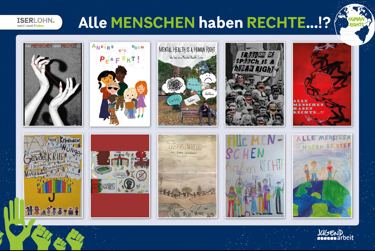 Die Siegerplakate der Altersgruppen 16 bis 25 Jahre (obere Reihe) und 10 bis 15 Jahre wurden in einer Collage zusammengefasst, die ab sofort im öffentlichen Raum zu sehen ist.