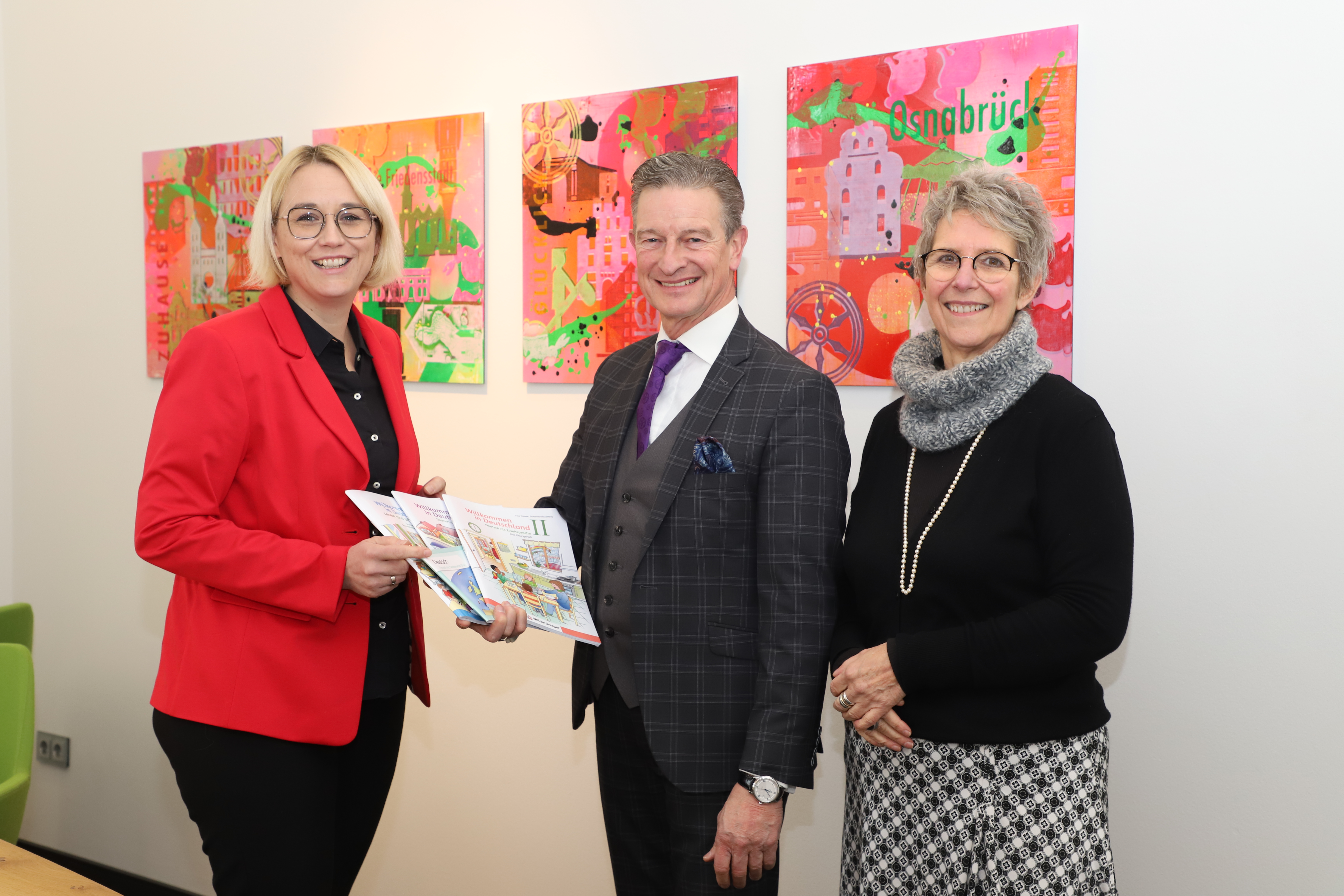 Auf die Wissensstände der jungen Geflüchteten abgestimmte Lernmaterialien konnten durch die Spende der Patsy & Michael Hull Foundation und des Bridge Clubs Osnabrück angeschafft werden und kommen auch schon zum Einsatz. (von links) Oberbürgermeisterin Katharina Pötter, Michael Hull und Ute Tromp, Leiterin des Fachdienstes Bildung, freuen sich.