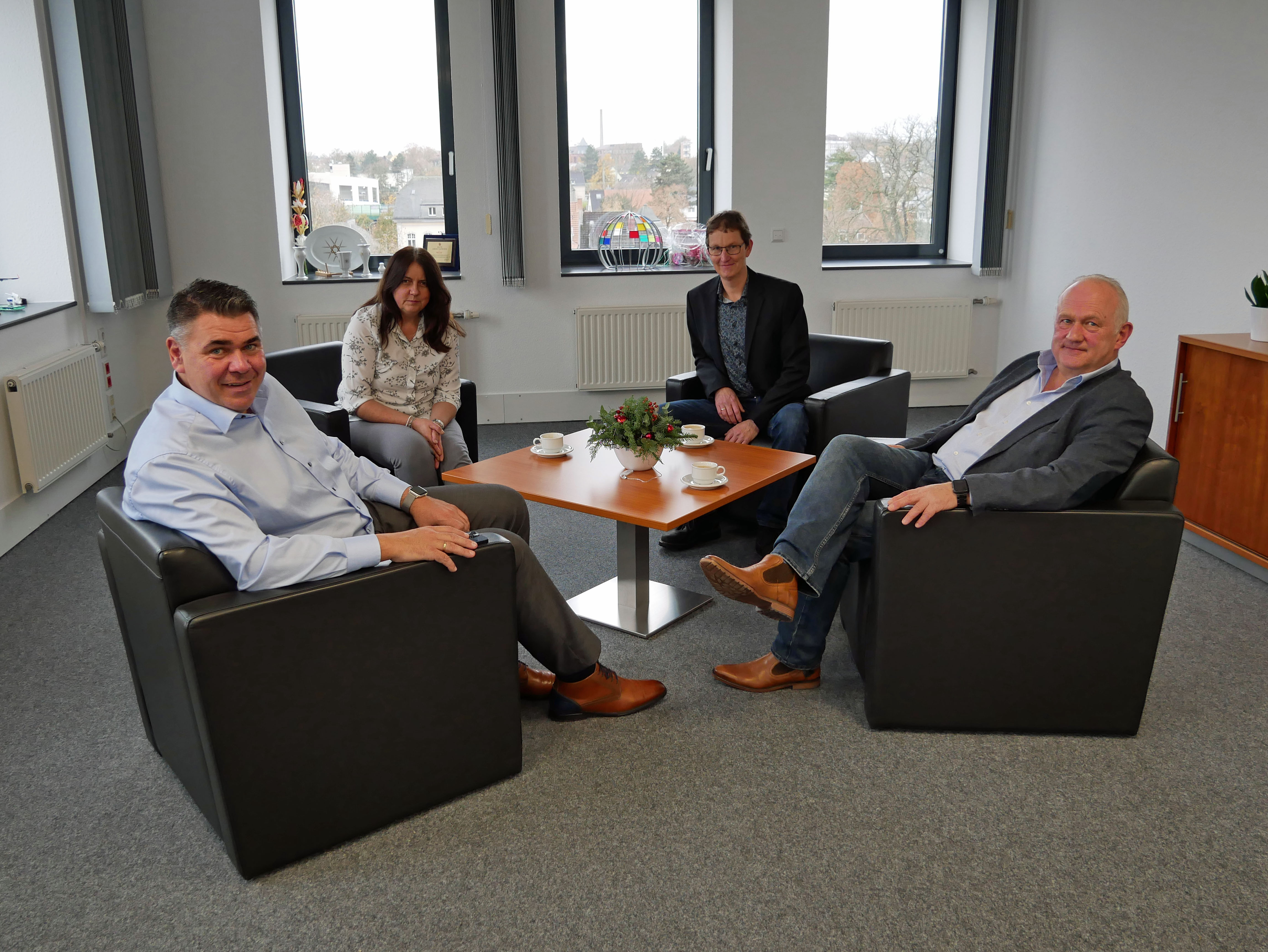 Landrat Mario Löhr, Fachbereichsleiterin für Schule und Bildung Anja Seeber und Dezernent Holger Gutzeit heißen den neuen Schulleiter Kay Eckebrecht (2 v.r.) vom Förderzentrum Nord willkommen. Foto: Leonie Bleimling - Kreis Unna