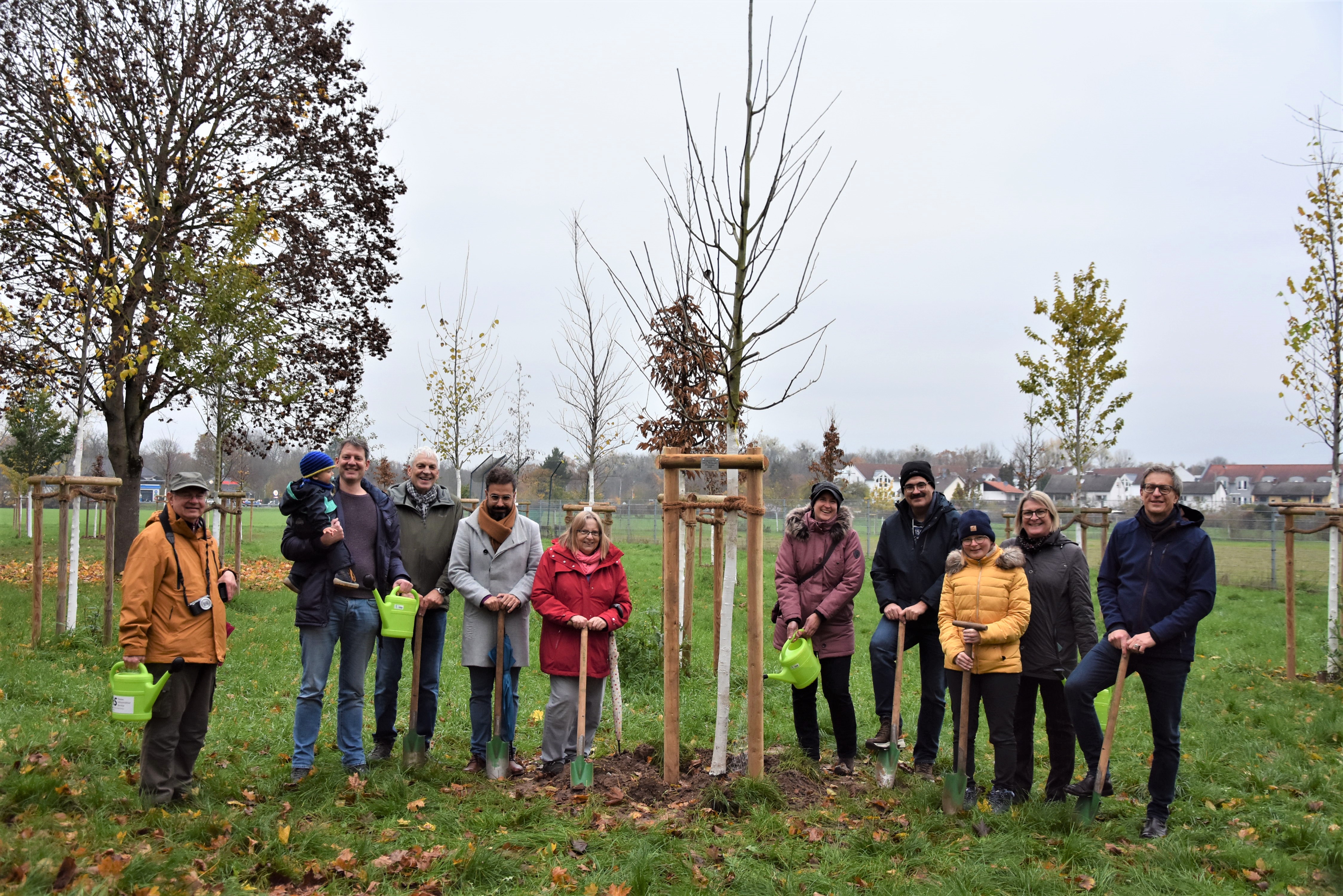 Acht Bürgerinnen und Bürger sowie zwei Vereine haben in diesem Jahr insgesamt 16 neue Bäume für das Hanauer Bürgerwäldchen gespendet. Stadtrat Thomas Morlock (rechts) begrüßte einige von ihnen bei einer Begehung des Areals.