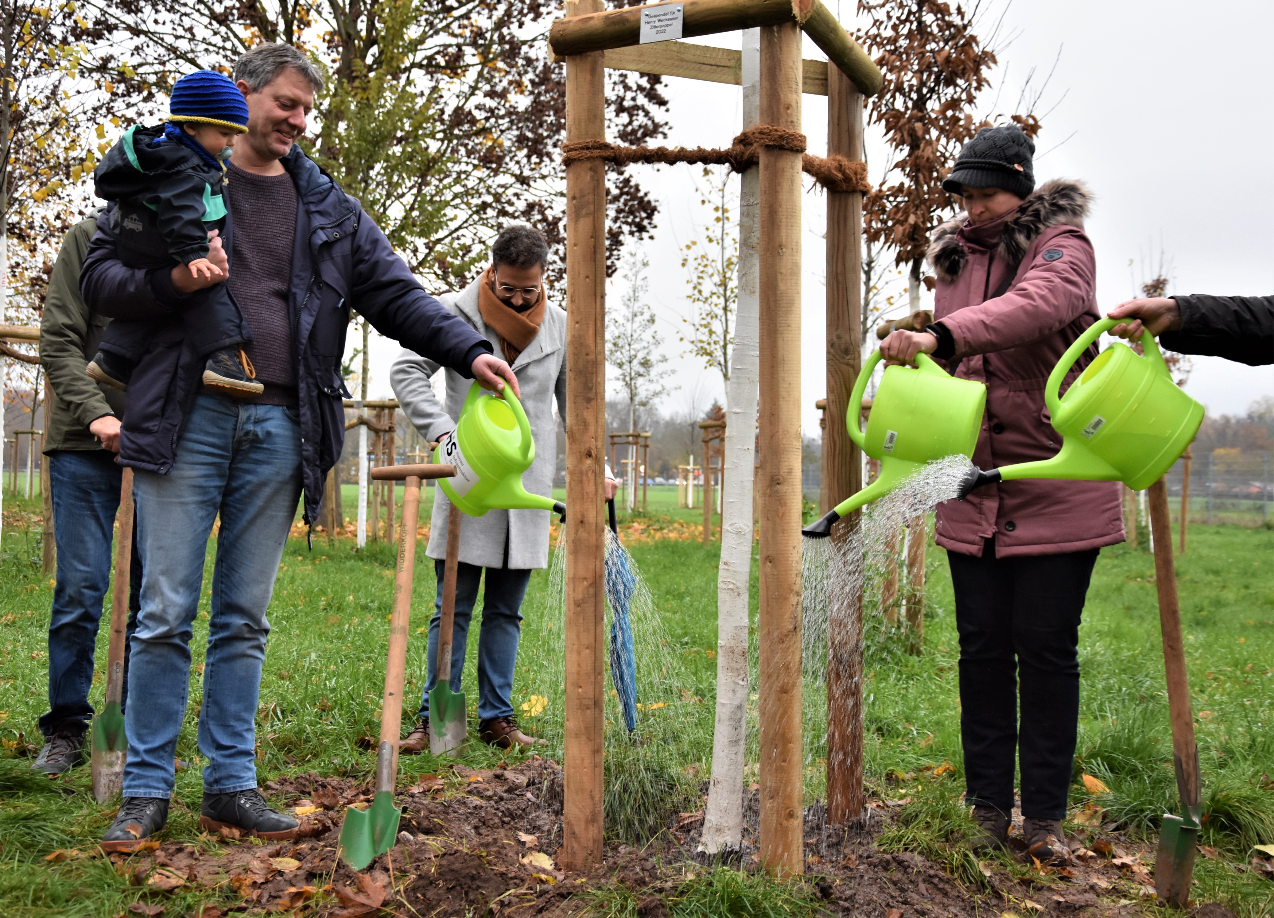 Während der Begehung des Bürgerwäldchens hatten die Spenderinnen und Spender die Möglichkeit, ihren Baum ein erstes Mal zu bewässern.