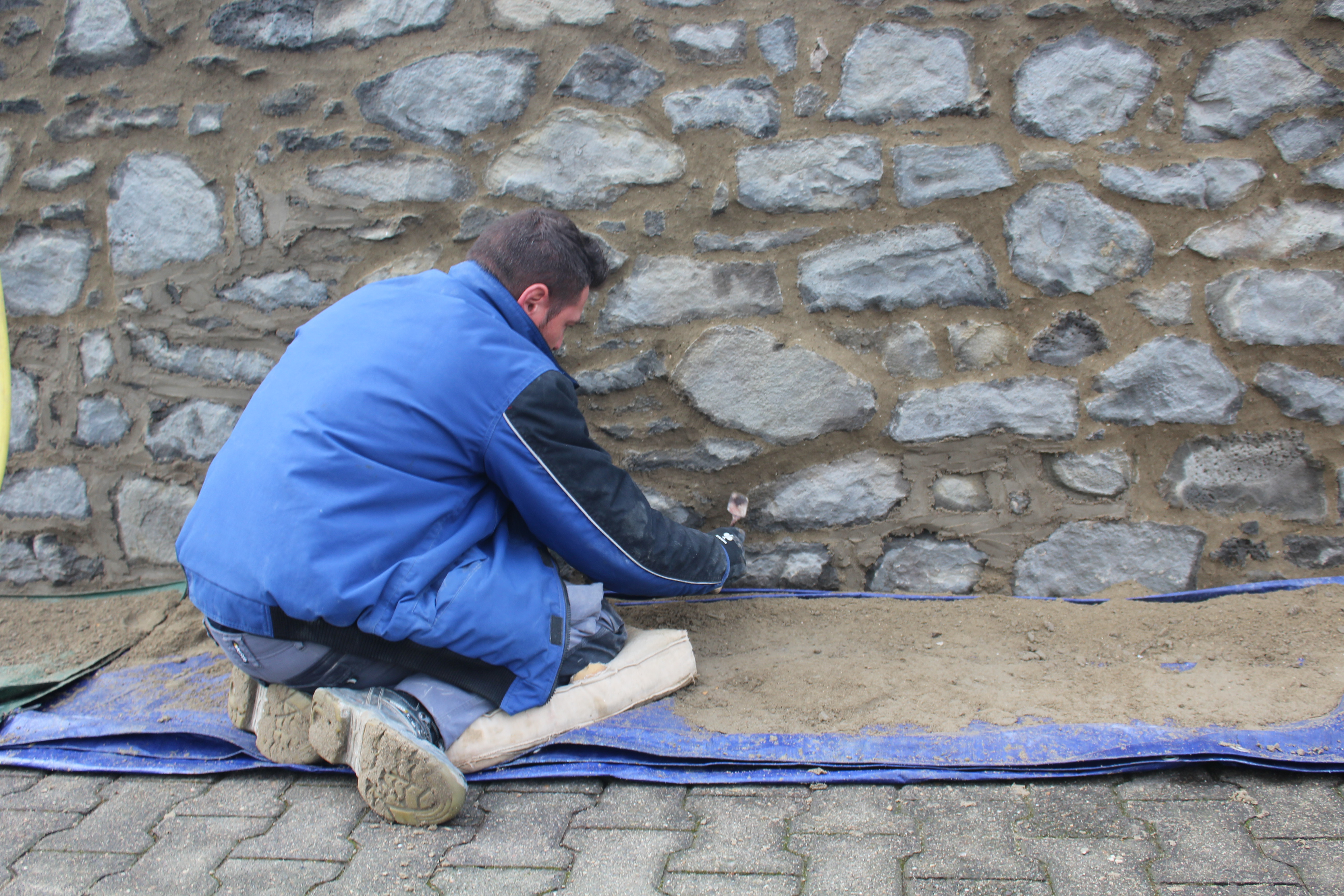 Nachdem die alte Mörtelschicht abgetragen und das Mauerwerk mit Granulat gereinigt wurde, wird mit Mörtel neu verfugt. Sämtliche Arbeiten erfolgen dabei in Handarbeit und Stein für Stein.