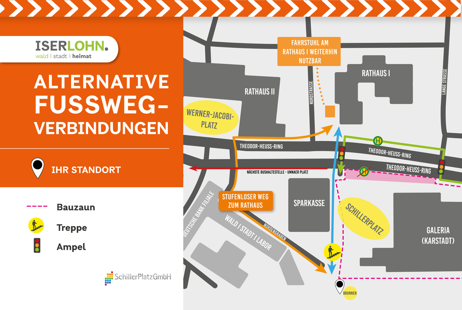 Während der Sperrung der Bushaltestelle und des Fußweges an der Schillerplatz-Baustelle können Fußgängerinnen und Fußgänger die gegenüberliegende Straßenseite benutzen.