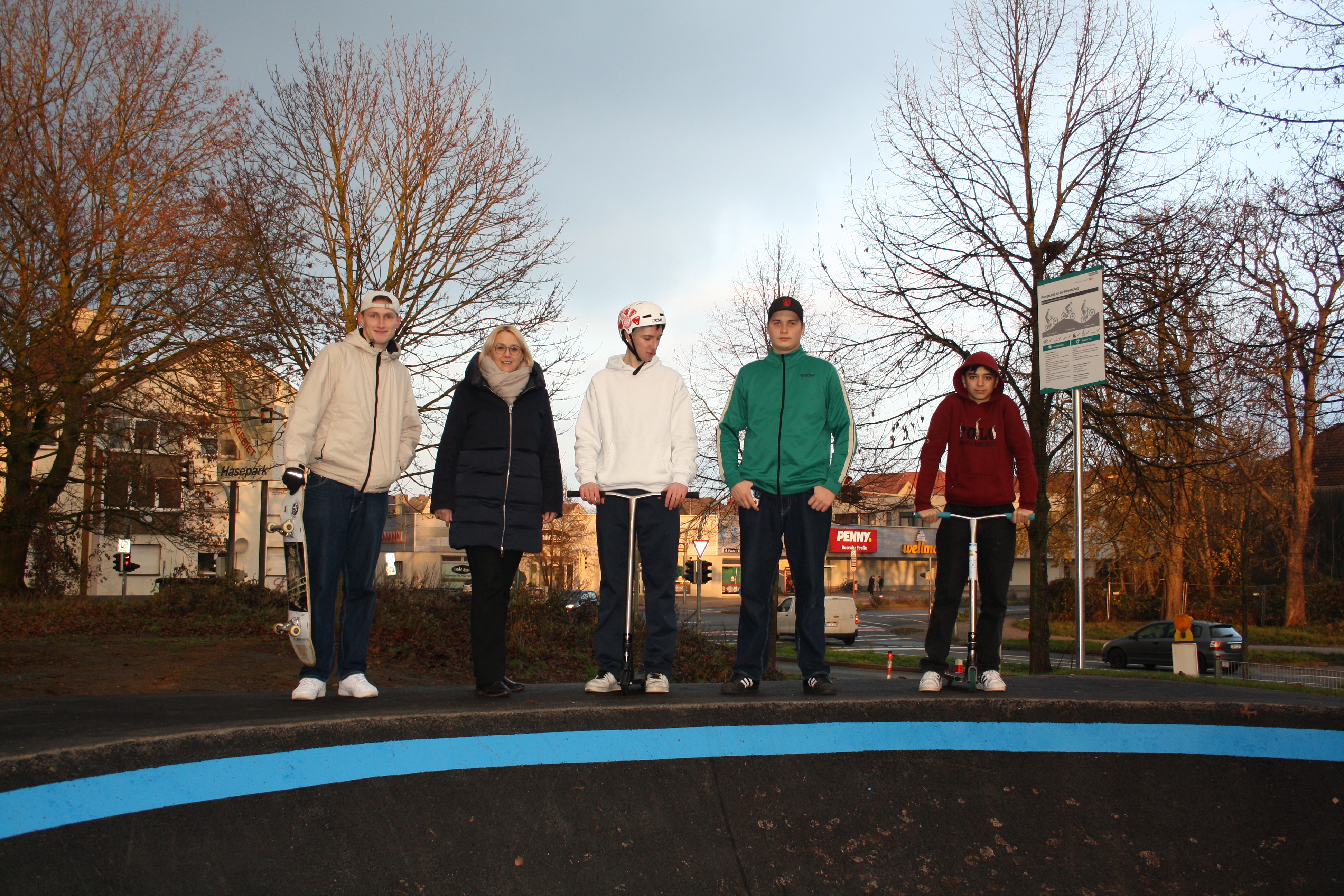 Oberbürgermeisterin Katharina Pötter zu Besuch beim neuen Pumptrack, den die jungen Scooter-Fahrer schon auf Herz und Nieren geprüft haben.