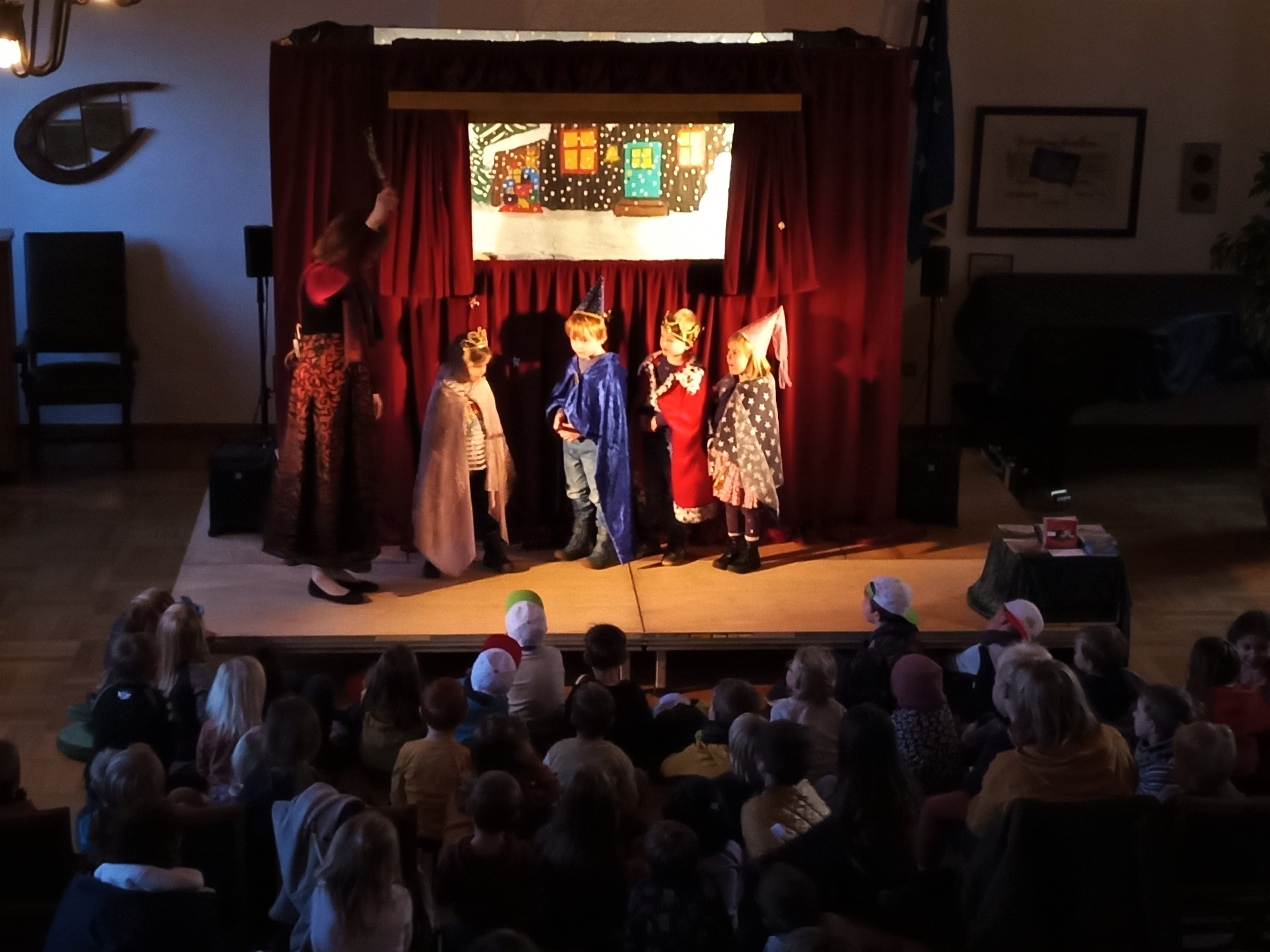 Vier Kinder stehen als Prinzessin, König, Fee und Zauberer verkleidet vor der Märchenbühne.