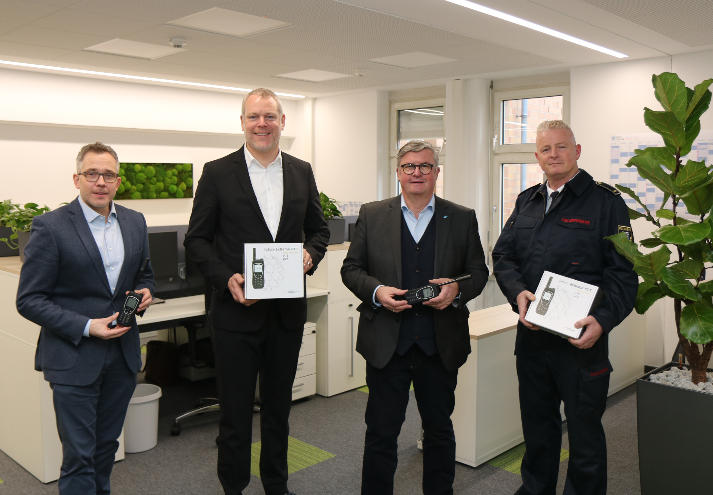 Auf dem Bild v.l.n.r.: Dezernent Jens Ernesti, Landrat Dr. Andreas Coenen, Bürgermeister Karl-Heinz Wassong und Michael Fothen von der Kreisleitstelle stellen die angeschafften Satellitentelefone vor.