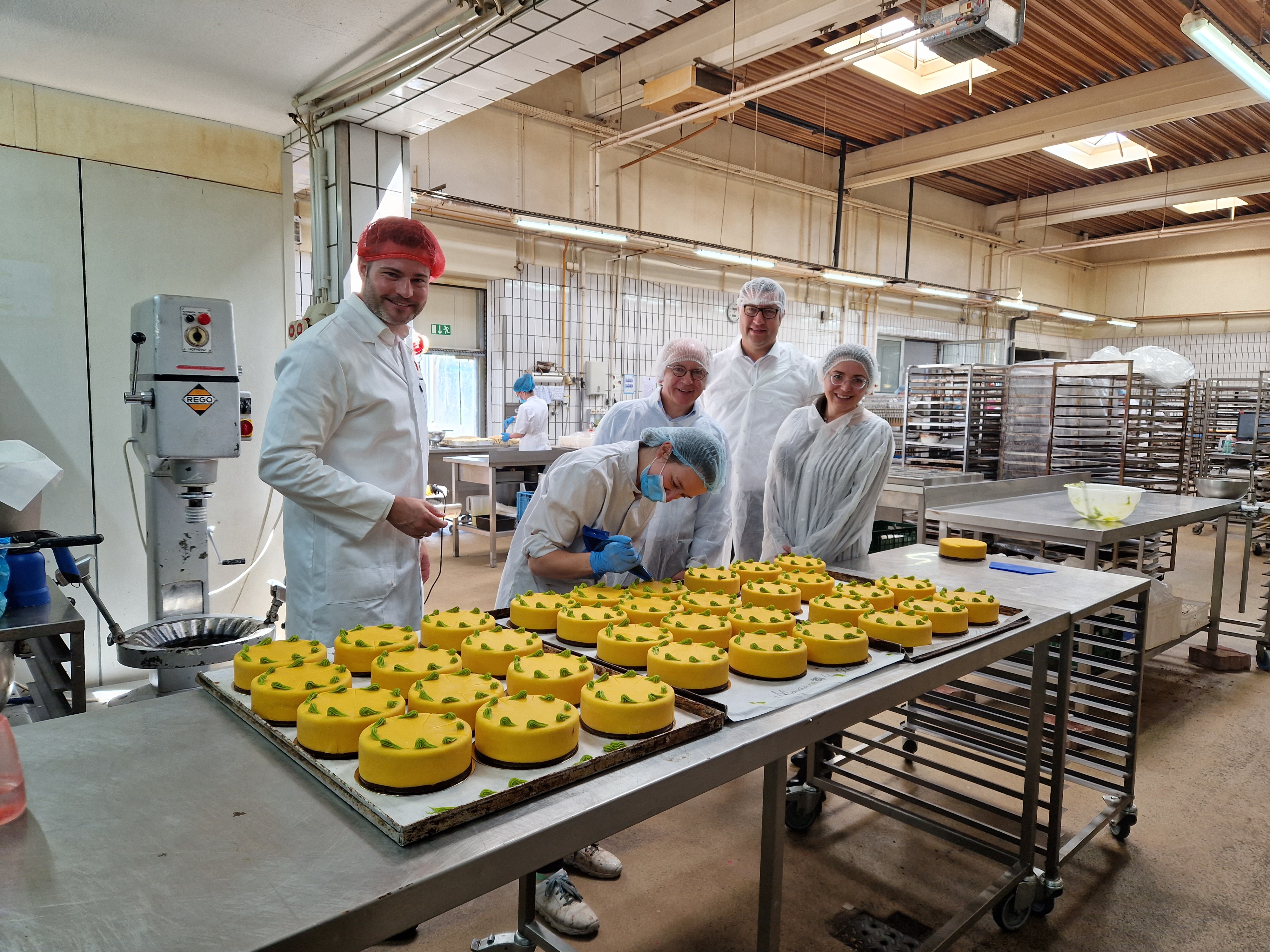 Stefan Adam von der FH Münster (3.v.r.), Heiner Hoffschroer (WVS; 2.v.r.) und Varvara Leinz (WESt; r.) besuchen Unternehmen im Kreis Steinfurt, um sie zu beraten und sich auszutauschen – wie hier im Jahre 2022 die Confiserie Rabbel.