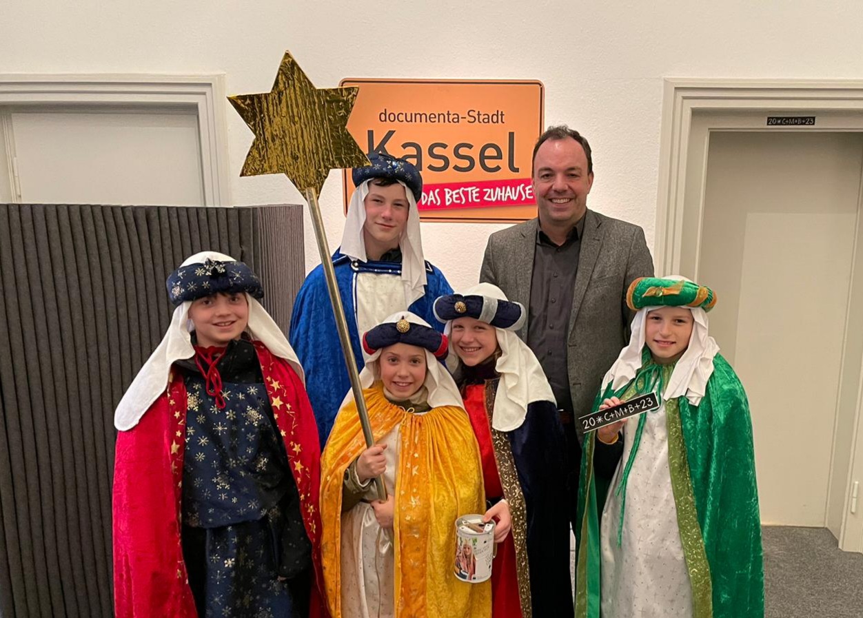 Besuch für Oberbürgermeister Christian Geselle von den Sternsingern, von links Johanna Elberfeld, Markus Kunze, Eva Shikolenko, Jele Kaiser und Stefan Kunze