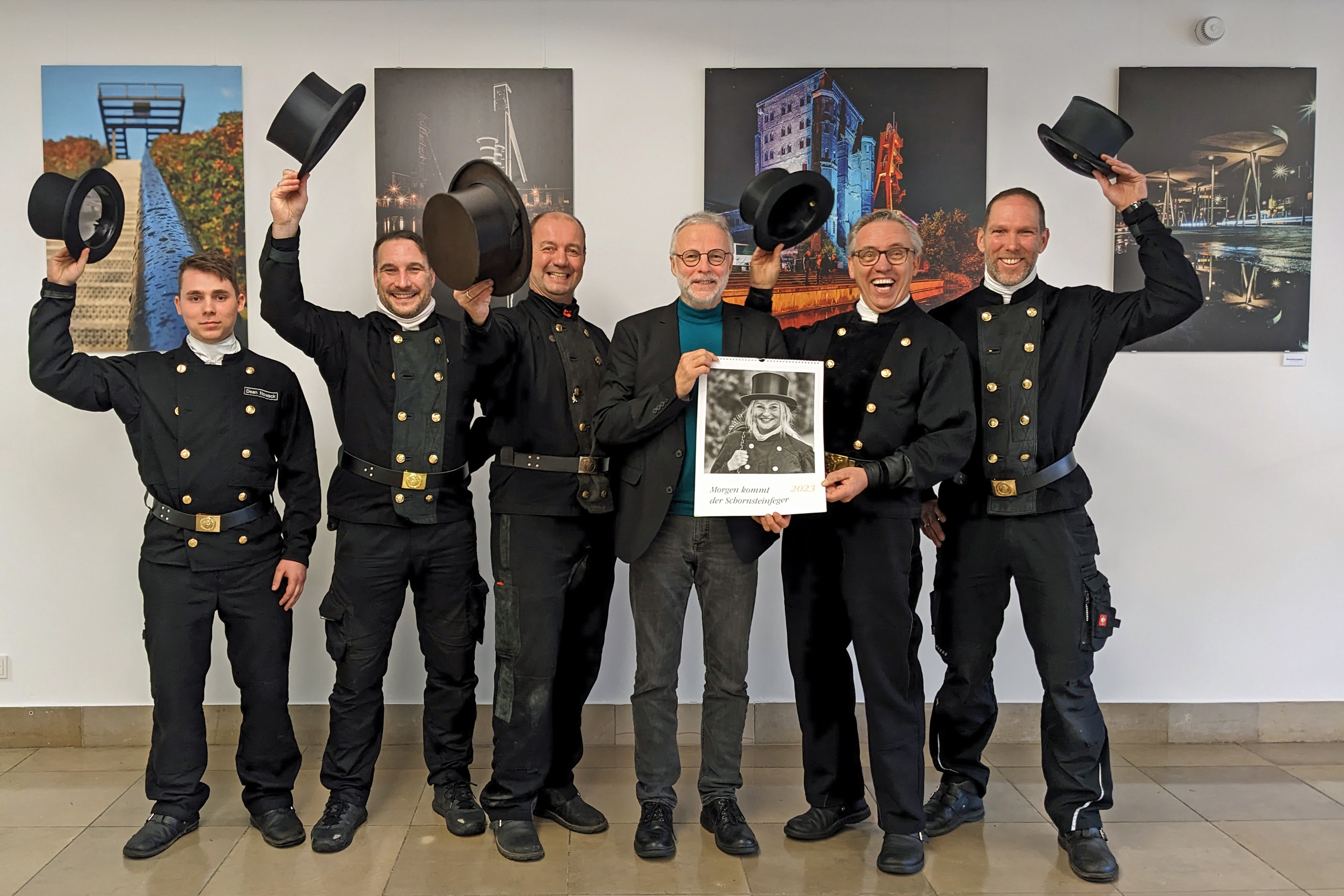 Traditionell zum Jahresbeginn empfing Bürgermeister Matthias Müller (3. v. r.) die Schornsteinfeger im Hertener Rathaus. Dean Nowack (v. l.), Benjamin Buckstegge, Heiko Stein, Martin Dodot und Kalle Hesselfort überreichten ihm einen Schornsteinfeger-Wandkalender und wünschten für das neue Jahr viel Glück und alles Gute (Foto: Stadt Herten).