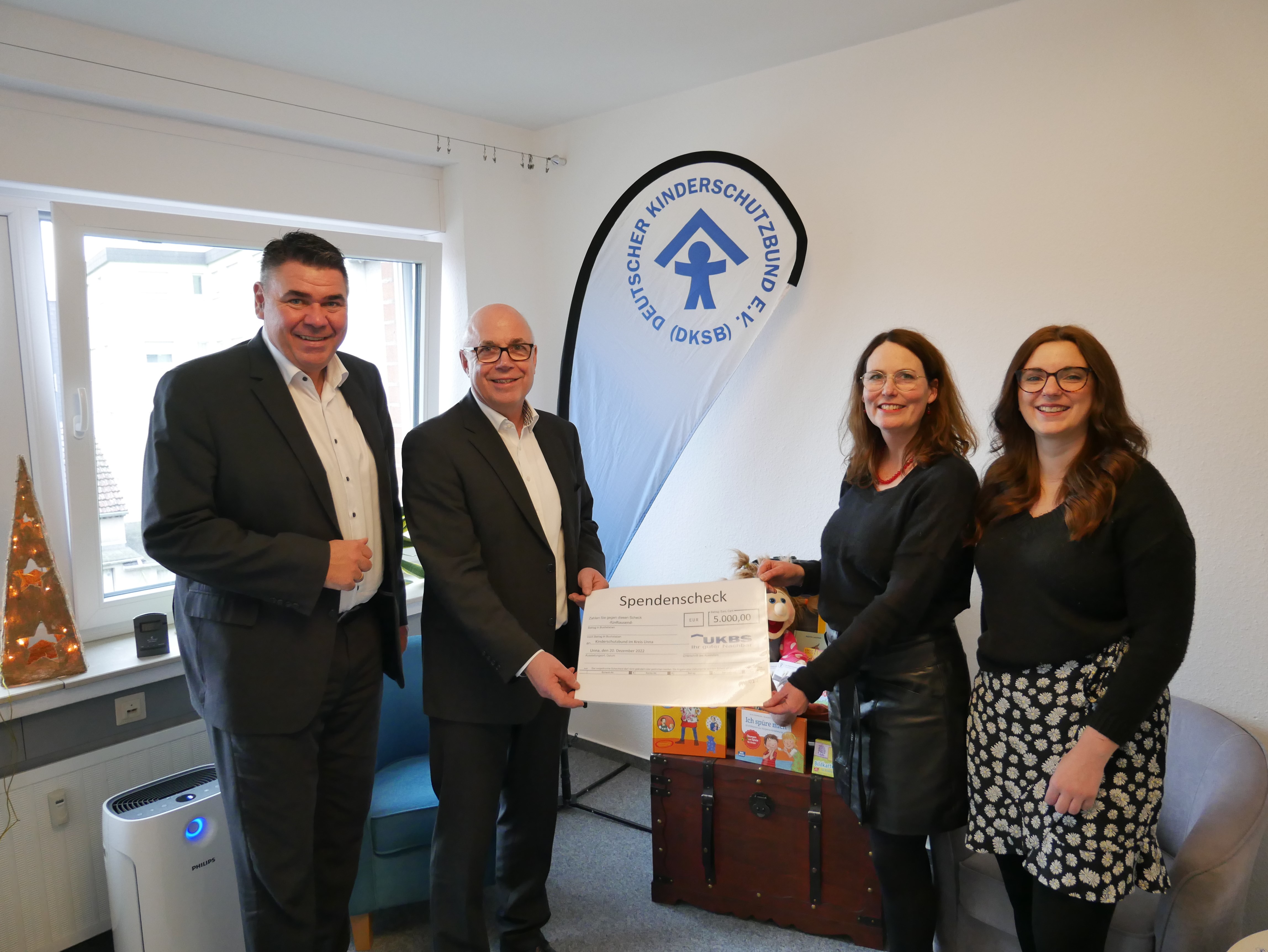Landrat Mario Löhr (l.) und UKBS-Geschäftsführer Matthias Fischer übergeben Dr. Henriette Schildberg und Johanna Löw die Spende in Höhe von 5000 Euro. Foto: Leonie Bleimling – Kreis Unna