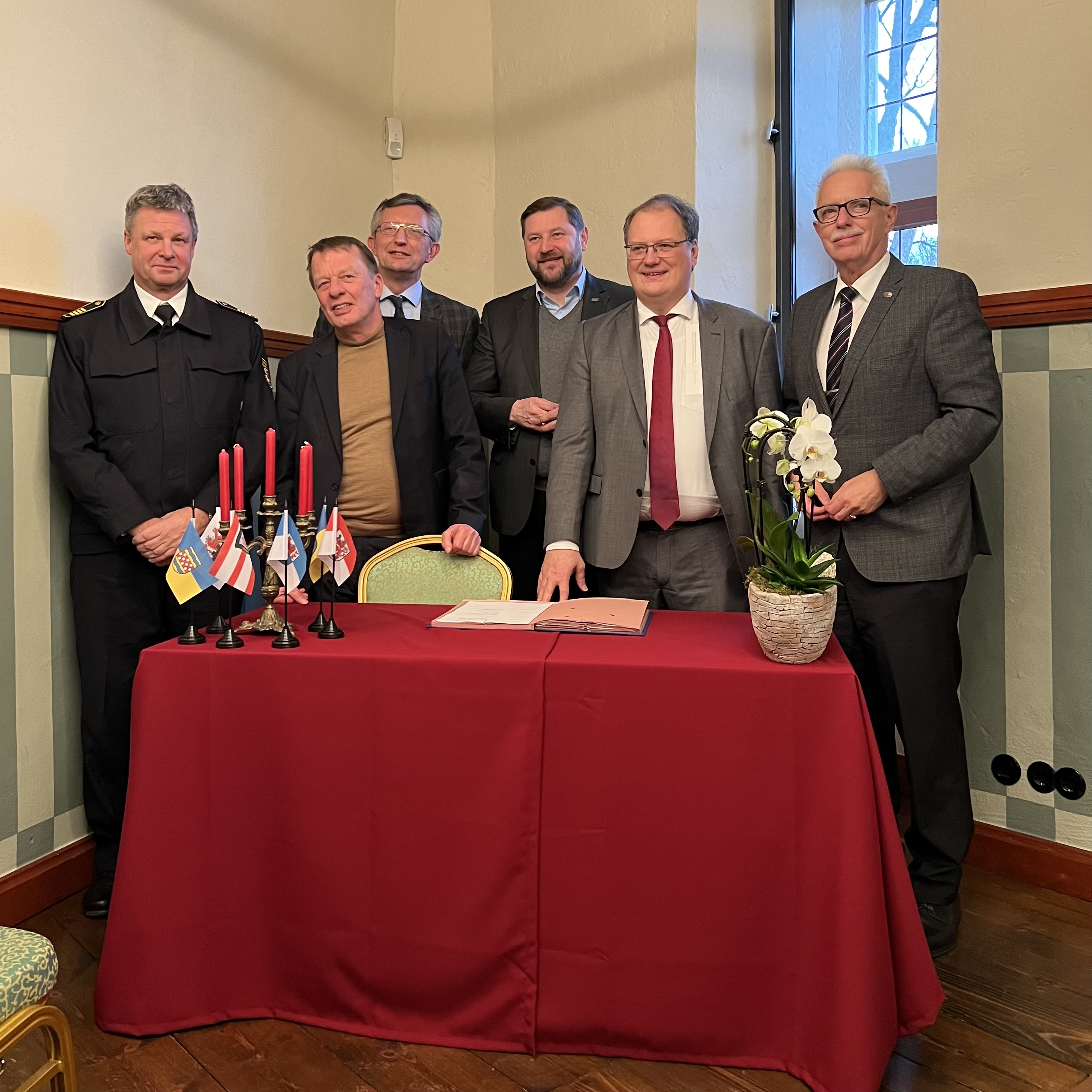 Hermann Greven, Leiter der Leverkusener Feuerwehr, Remscheids Oberbürgermeister Burkhard Mast-Weisz, Matthias Nocke, Dezernent für Kultur, Sport & Sicherheit und Ordnung der Stadt Wuppertal, Solingens Oberbürgermeister Tim Kurzbach, Olaf Schade, Landrat des Ennepe-Ruhr-Kreises, sowie Thomas Hendele, Landrat des Kreises Mettmann, (v.l.n.r.) unterzeichneten in Solingen die Gründungsvereinbarung für das Telenotarztsystem Bergisches Land.