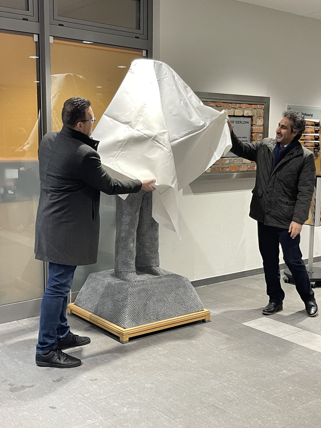 Bürgermeister Michale Joithe und der Künstler Ihsan Idrees Azeez enthüllen im Stadtbahnhof die Statue „Der Lehrer“.