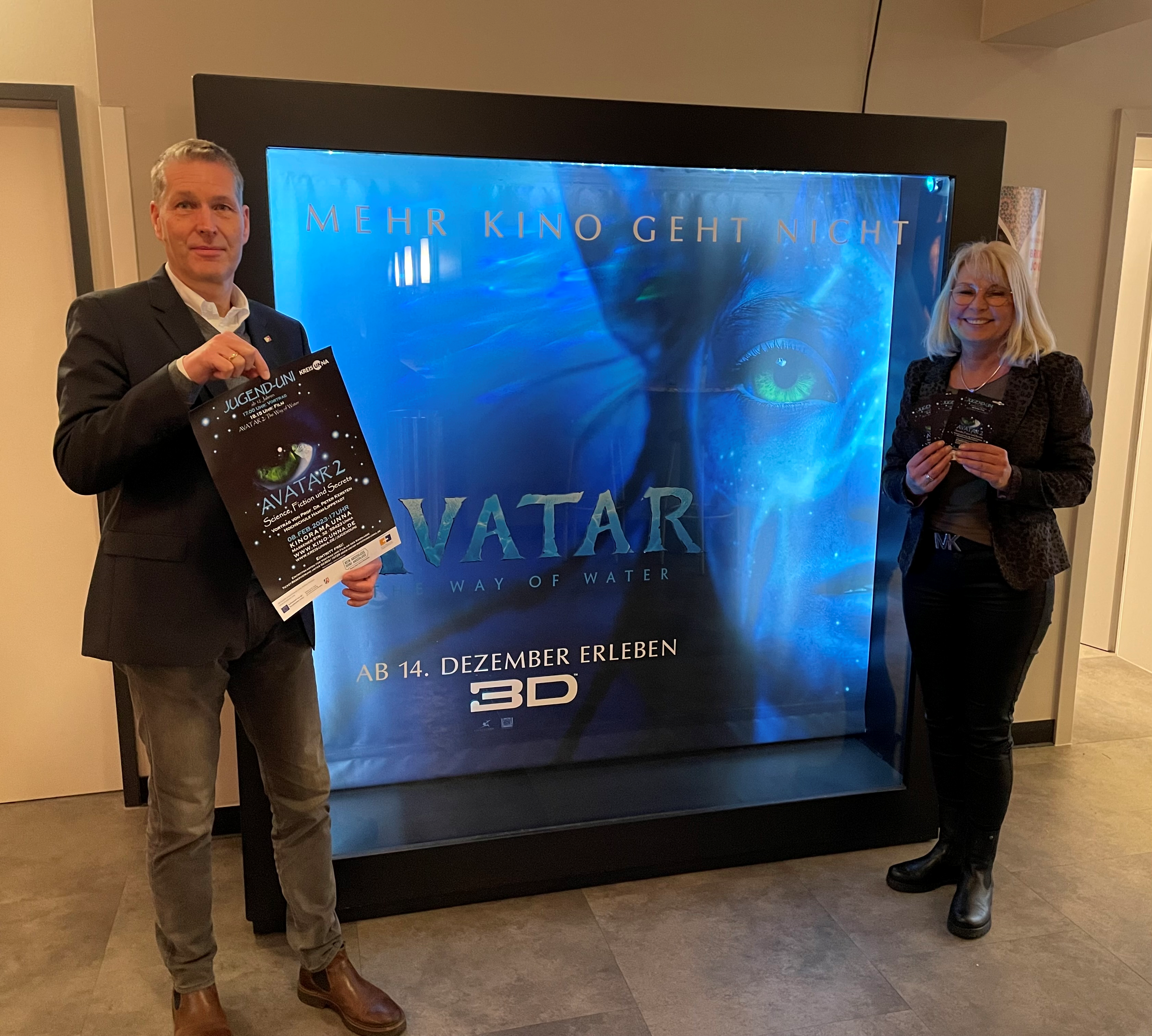Die Jugend-Uni zu dem Film Avatar 2 mit Referent Prof. Dr. Peter Kersten von der Hochschule Hamm-Lippstadt und Organisatorin Martina Bier von dem Dienstleistungszentrum Bildung des Kreises Unna. Foto: Kreis Unna.