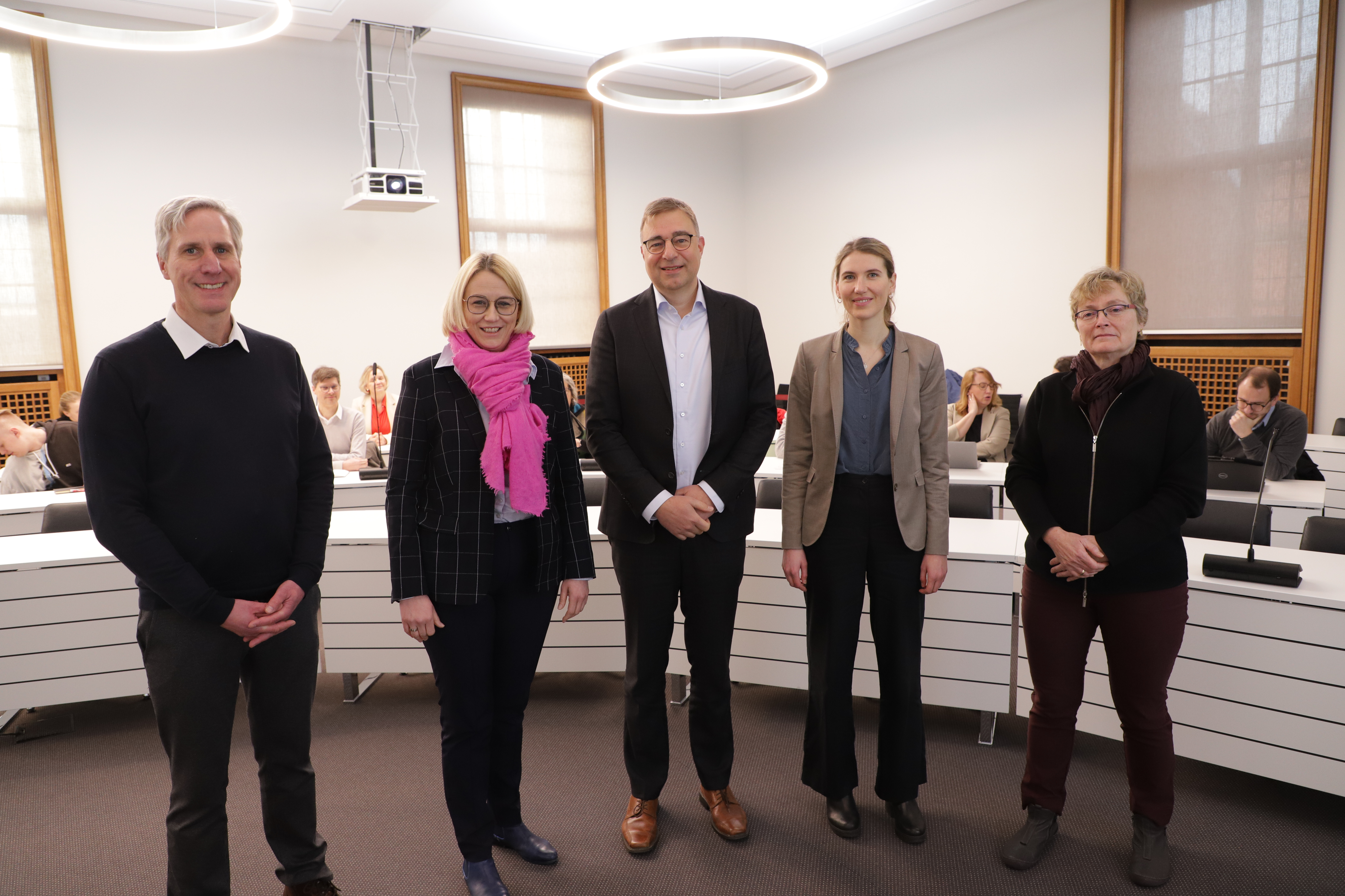 Auftaktveranstaltung Vorreiterkonzept Klimaschutz im Ratssitzungssaal: Tobias Langer, Fachdienstleiter Umweltplanung (links), Oberbürgermeisterin Katharina Pötter, Robert Werner, Geschäftsführer des Hamburg Instituts und seine Mitarbeiterin Jana Kapfer sowie Claudia Leyers, Leiterin des Fachbereichs Umwelt und Klimaschutz.