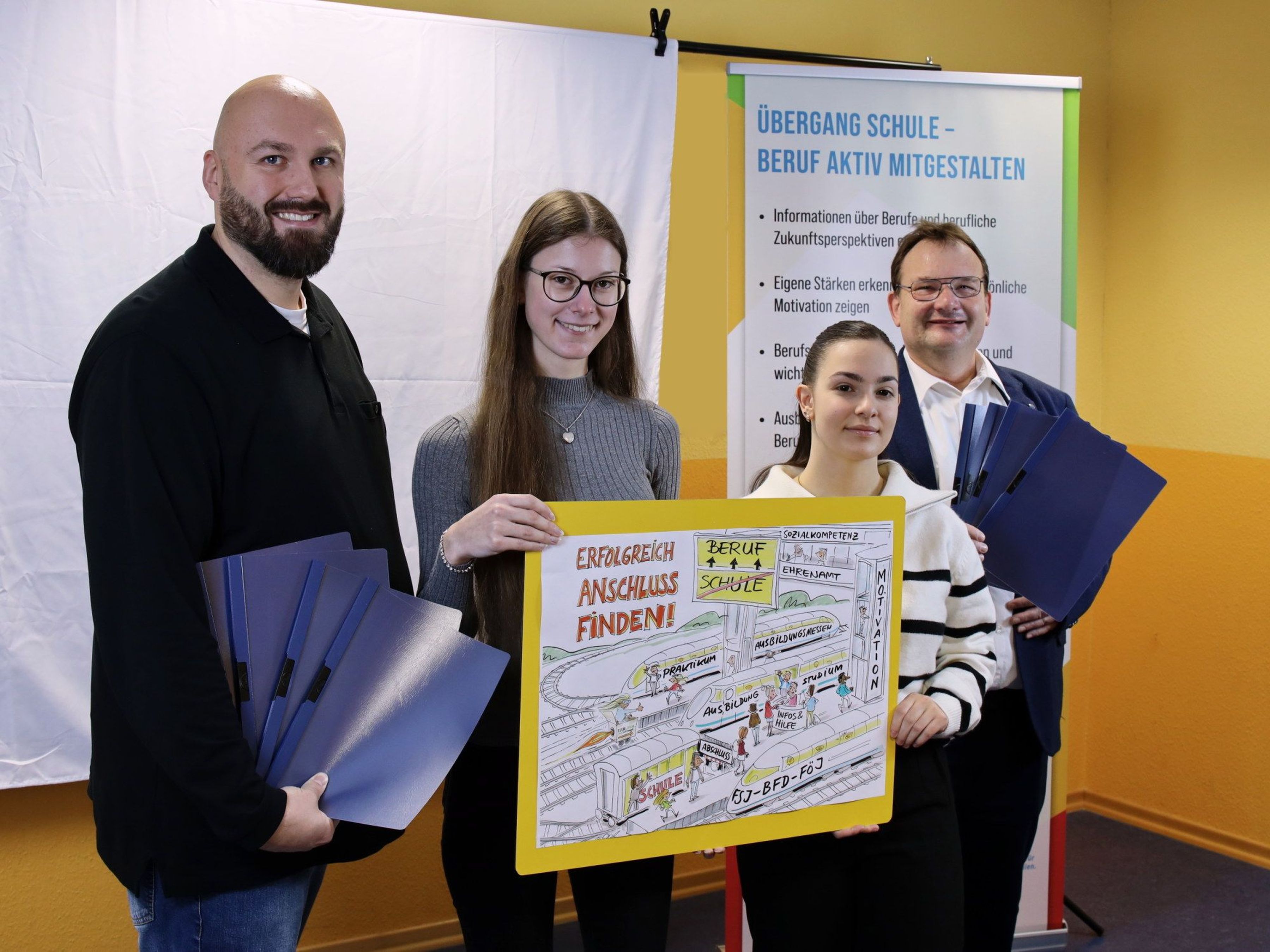 Abteilungsleiter Oliver Funke und die Auszubildenden Marie Flormann und Tugba Günaydin präsentieren gemeinsam mit Hinrich Riemann (v.l.) vom Übergangsmanagement Schule - Beruf den neuen Werbe-Cartoon.