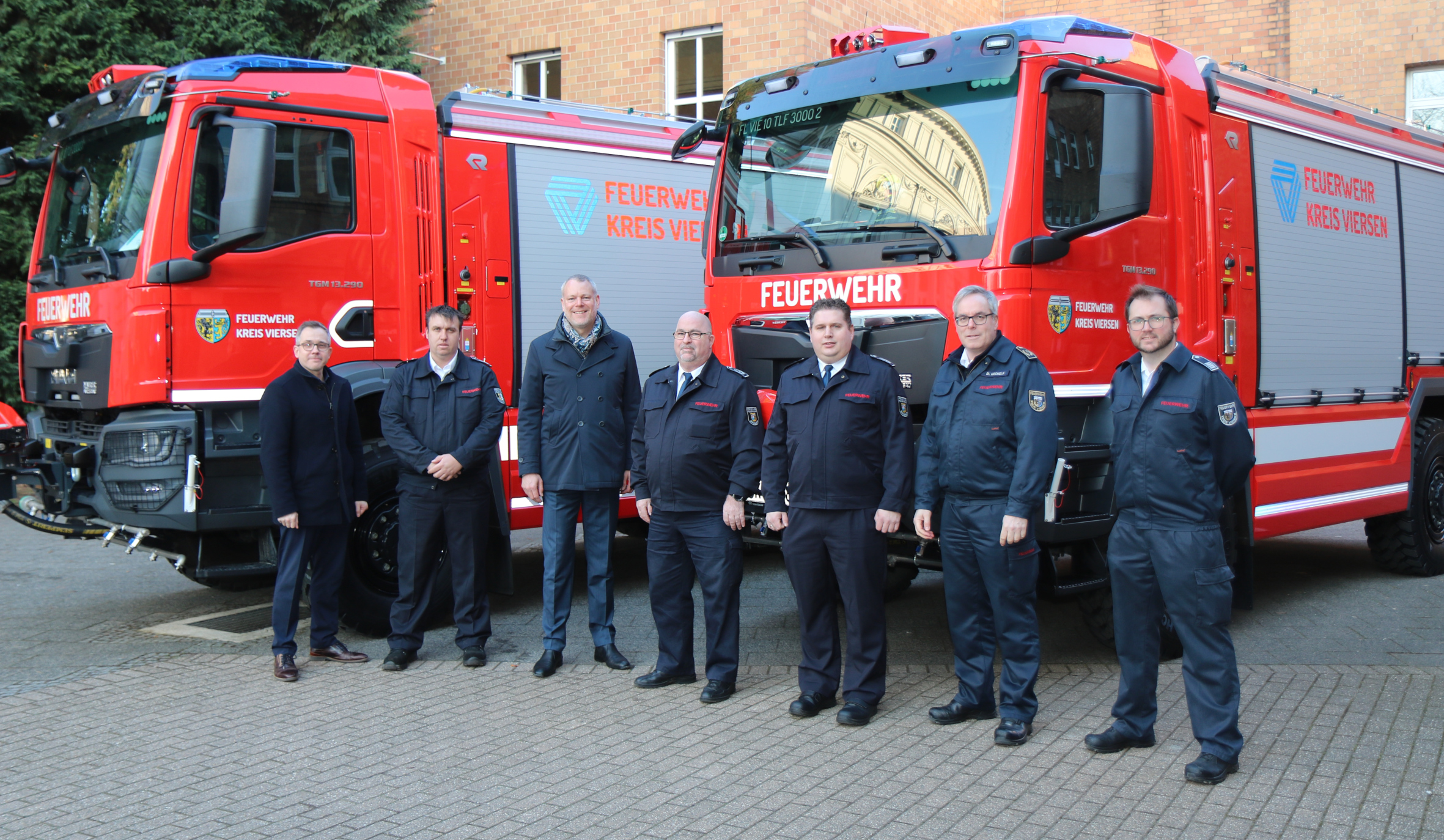 v.l.n.r.: Jens Ernesti (Dezernent für Bevölkerungsschutz, Soziales, Gesundheit und Arbeit des Kreises Viersen), Jens Claßen (stellvertretender Leiter der Freiwilligen Feuerwehr Niederkrüchten), Landrat Dr. Andreas Coenen, Ralf Götzmann (stellvertretender Leiter der Freiwilligen Feuerwehr Brüggen), Marc Pollen (Wehrleiter der Freiwilligen Feuerwehr Brüggen), Rainer Höckels (Leiter des Amts für Bevölkerungsschutz des Kreises Viersen) und Simon Fritsch (Leiter der Abteilung für Brand- und Katastrophenschutz des Kreises Viersen)