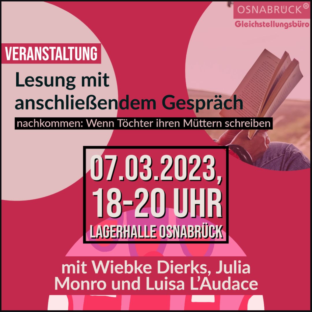 Das Gleichstellungsbüro der Stadt Osnabrück lädt ein zu einer Lesung für Dienstag, 7. März. Wiebke Dierks, Luisa L'Audace und Julia Monro lesen aus dem Buch „nachkommen: Wenn Töchter ihren Müttern schreiben“. Beginn ist um 20 Uhr im Spitzboden der Lagerhalle.