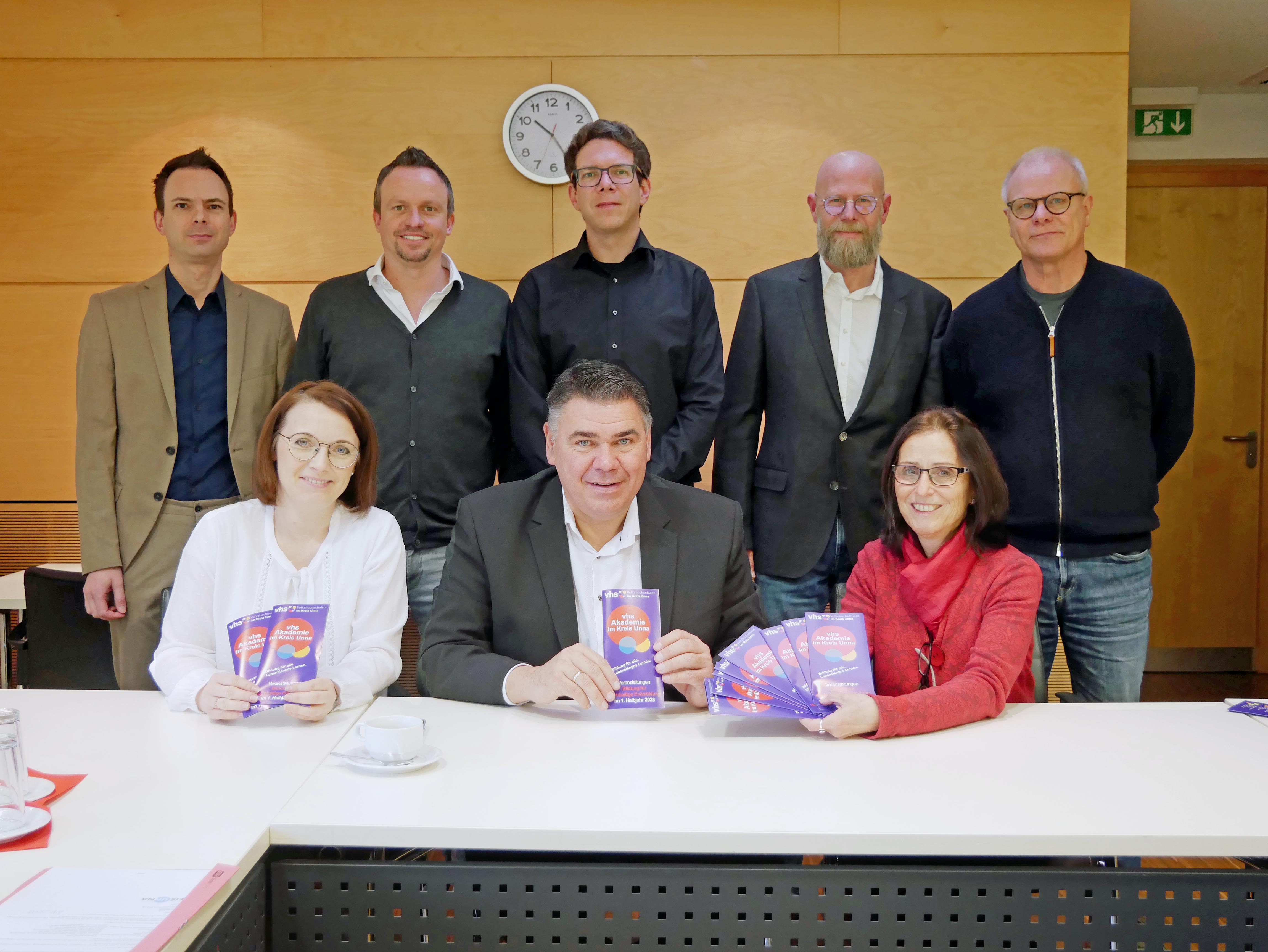 Die Volkshochschulleiter des Kreises Unna zusammen mit dem Landrat: (v. l. o): Rafael Schönhold (VHS Lünen), Benedikt Sträter (VHS Selm), Armin Eichenmüller (Leiter vom Bereich Weiterbildung der Kreisstadt Unna), Marco Dafov (VHS Schwerte), Michael Hahn (VHS Werne), Karolina Kubiak (VHS Kamen/Bönen), Landrat Mario Löhr und Brigitte Schubert (VHS Fröndenberg/Holzwickede). Foto: Leonie Joost - Kreis Unna.