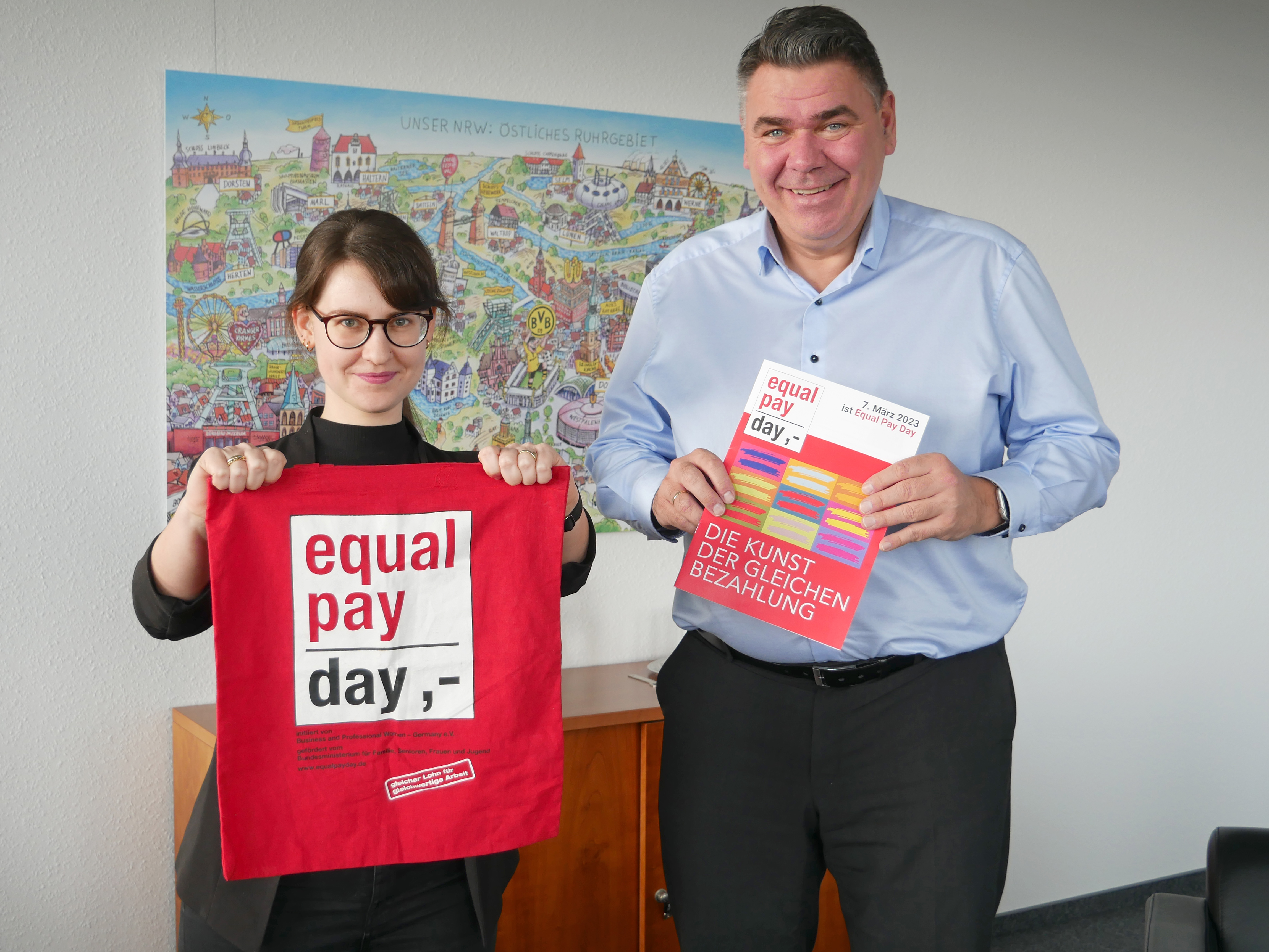 Landrat Mario Löhr und die Gleichstellungsbeauftragte Leonie Engelhardt machen auf die Lohnlücke zwischen Männern und Frauen aufmerksam.