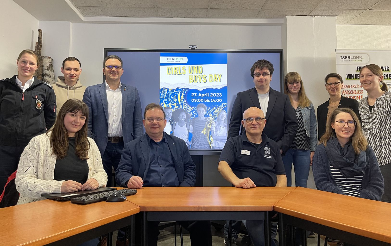 Das Team der Stadtverwaltung freut sich, viele Schülerinnen und Schüler am Girls- und Boys-Day begrüßen zu dürfen: (Stehend v.l.) Freya Balk (Feuerwehr Iserlohn), Jonas Oberste-Berghaus (Bereich IT), Bürgermeister Michael Joithe, Marvin Moog und Josie Piekert (Abteilung Geografische Informationssysteme), Ausbildungsleiterin Carmen Malkus und Simone Woznitza (Beraterin für Frauen und Mädchen); (sitzend v.l.) Projektmanagerin „Smart City“ Eva Linn, Hinrich Riemann (Übergangsmanagement Schule-Beruf), Slobodan Masanovic (Seniorenzentrum Waldstadt Iserlohn) und Gleichstellungsbeauftragte Patricia da Cruz Santos.